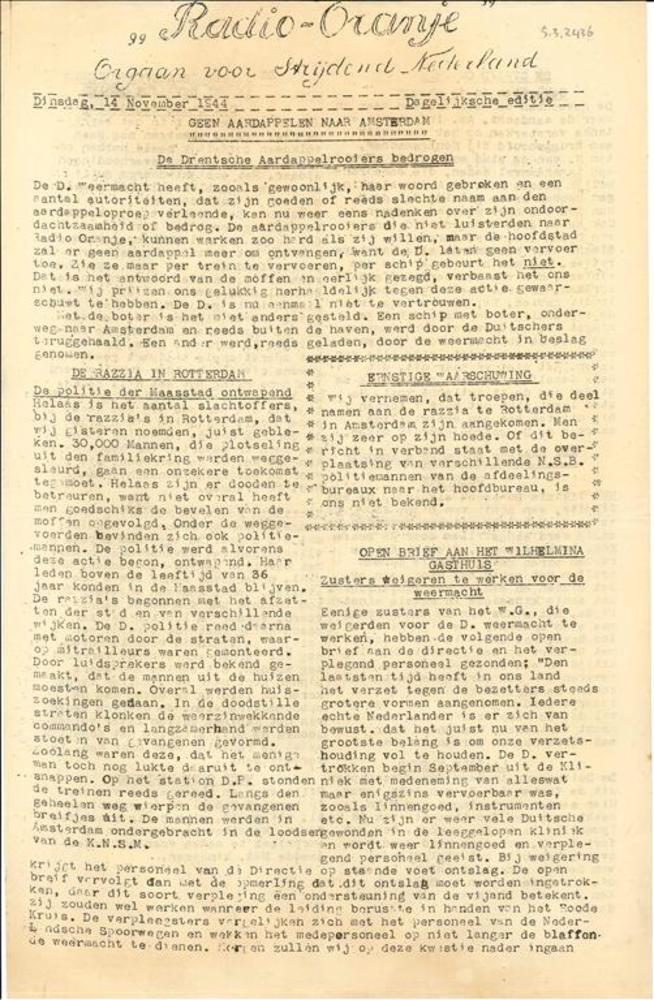 Radio Oranje, Orgaan voor strijdend Nederland, Dinsd...