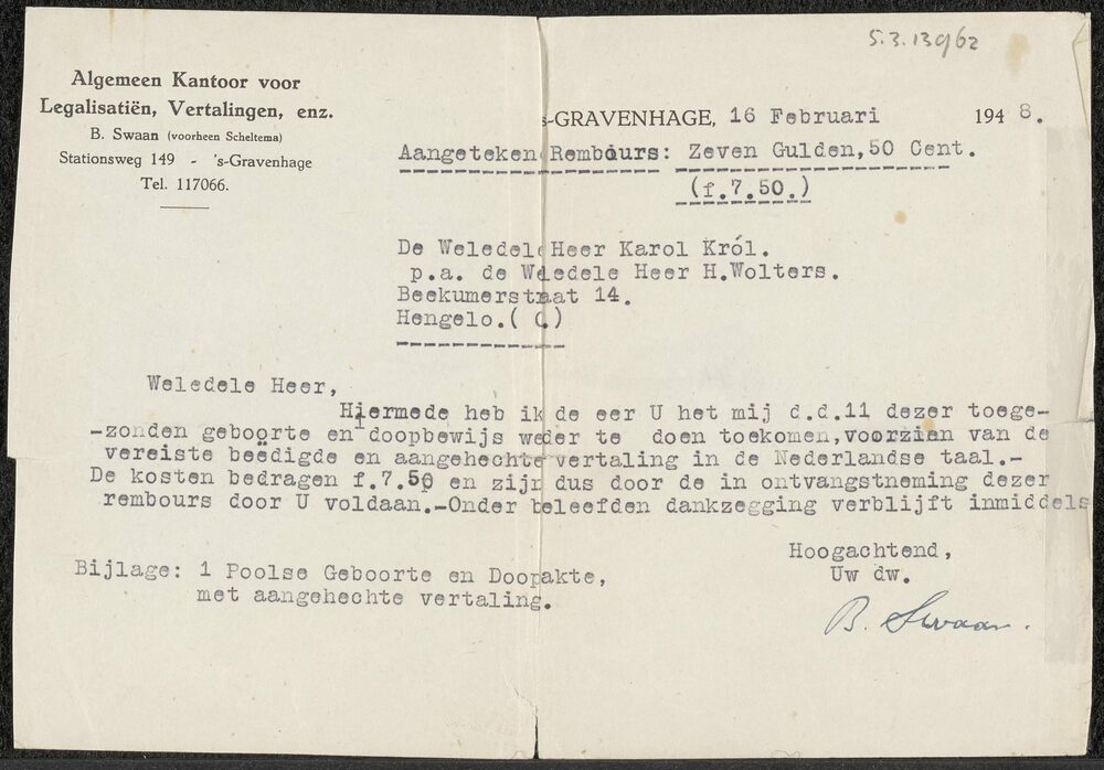 Brief van het Algemeen Kantoor Legalisatiën, Vertali...