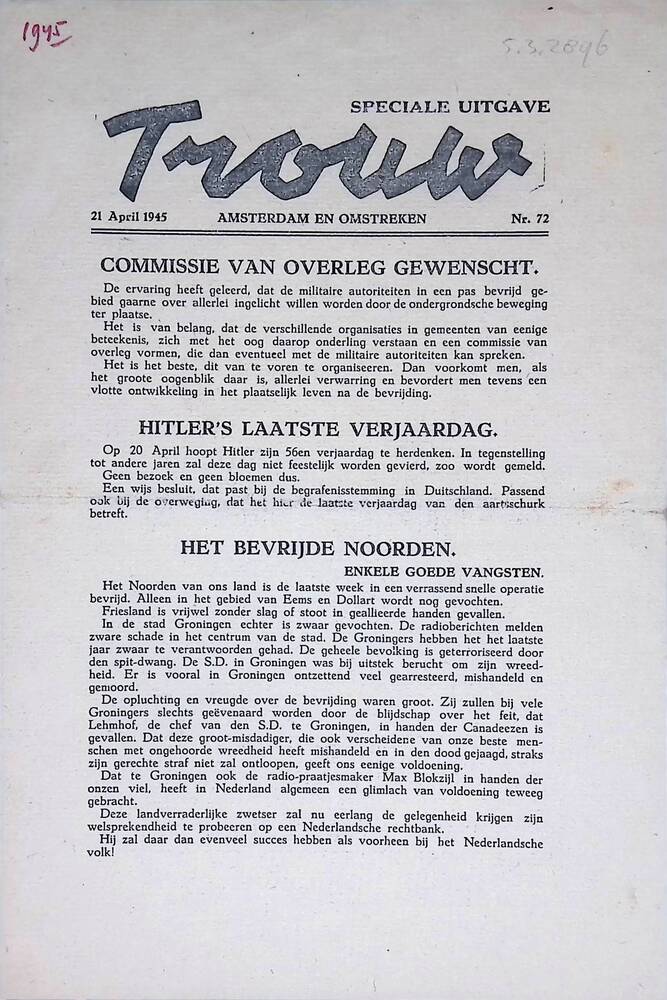 Bevrijdingskrant, behorend bij Libelle nr. 18, 1995