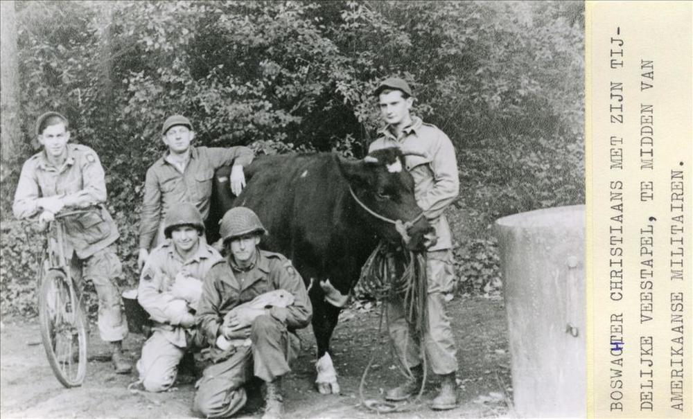 burger en vier amerikaanse militairen met koe, konij...