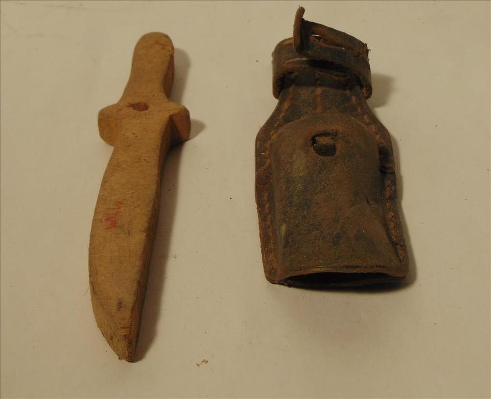 dolkhouder van zwart leer met een houten speelgoed mes