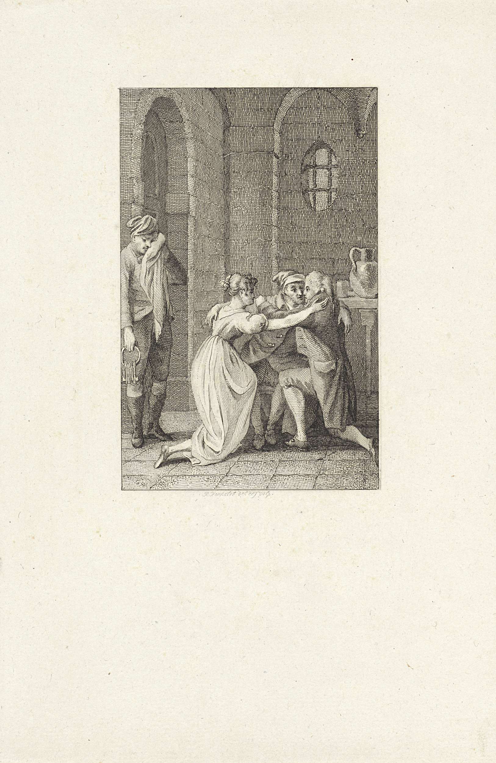 Twee mannen en een vrouw omhelzen elkaar in een kerker