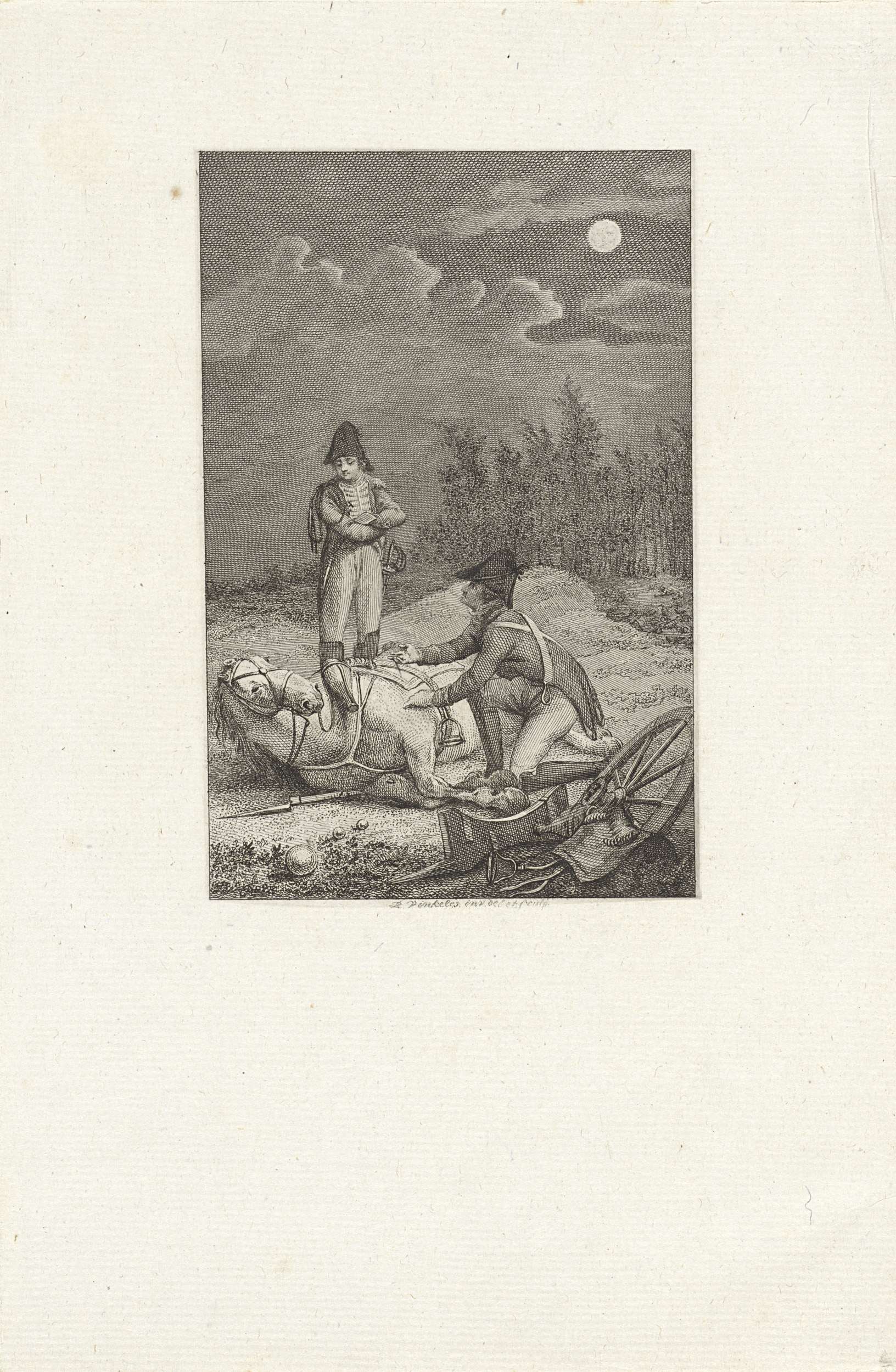 Nachtgezicht met twee soldaten bij een liggend paard