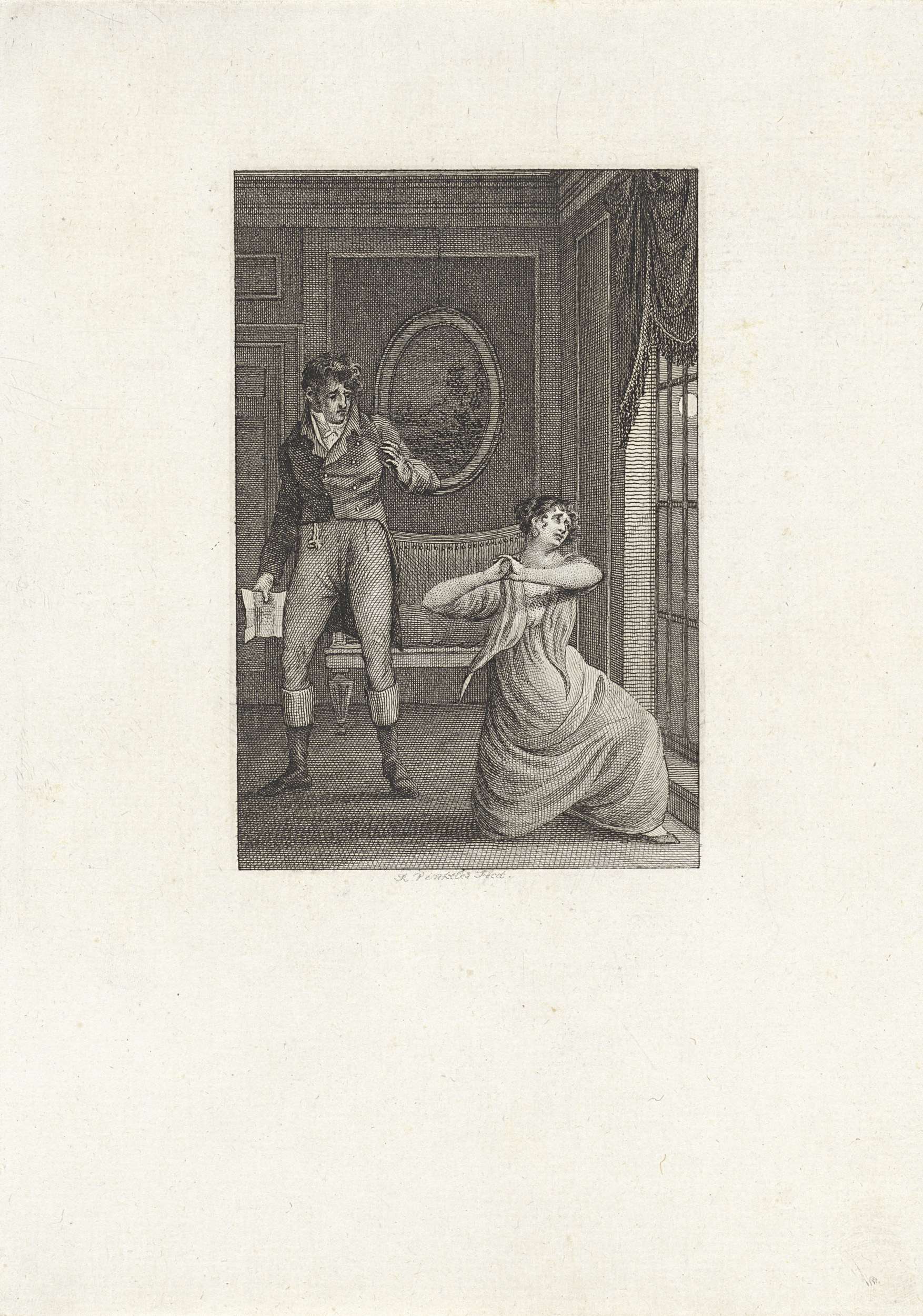 Man met een brief en een knielende vrouw voor het raam