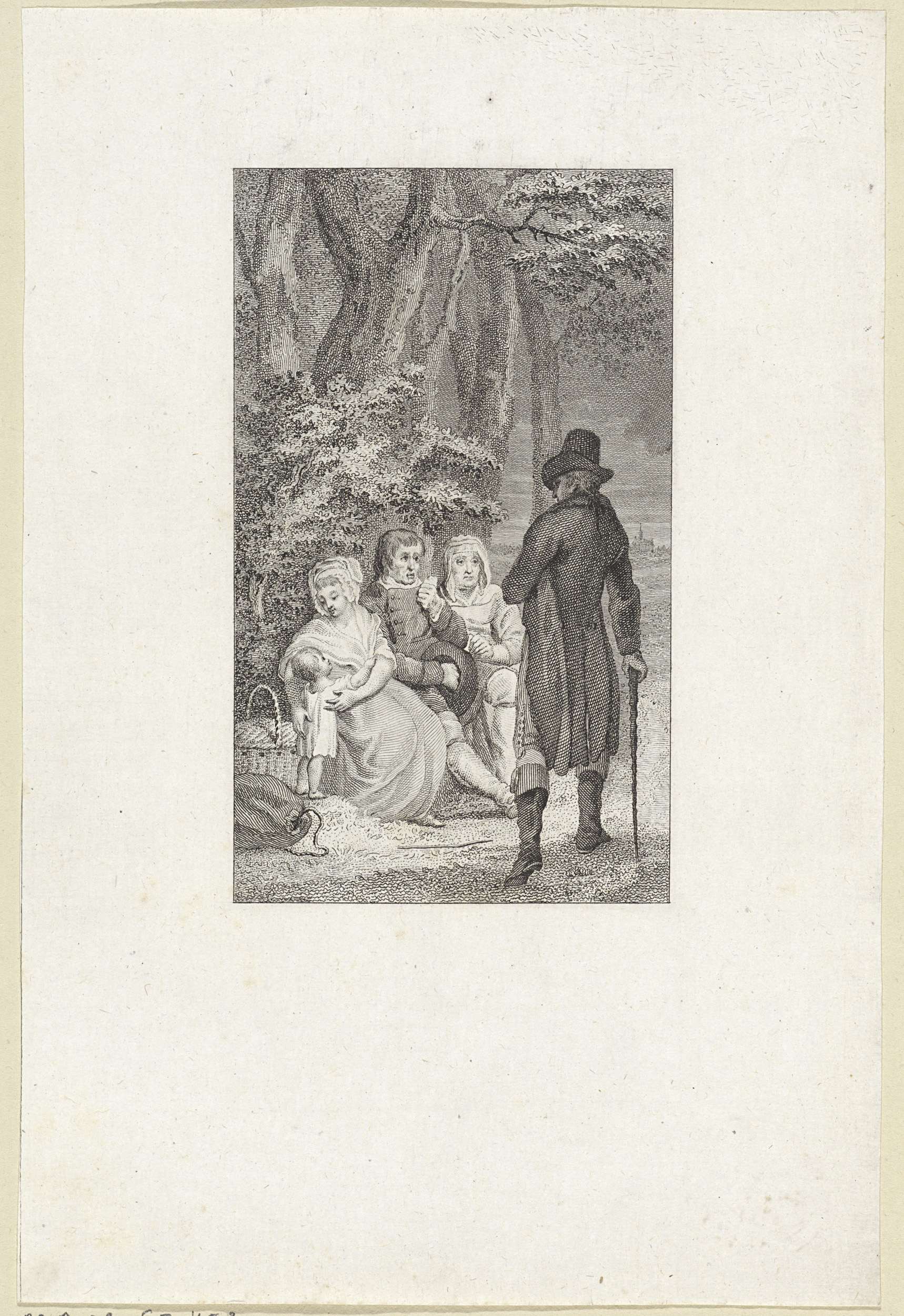 Bosgezicht met lieden die een gesprek voeren