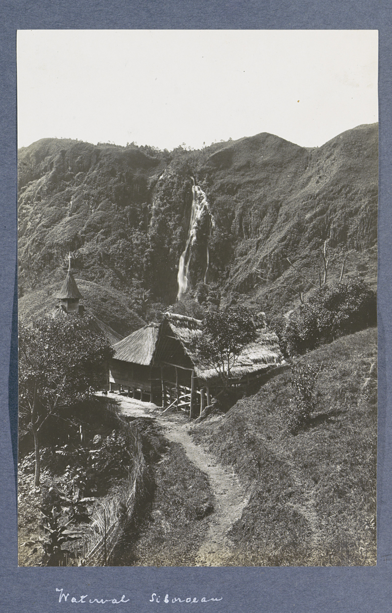 Waterval bij Siboroean in Nederlands-Indië met op de...