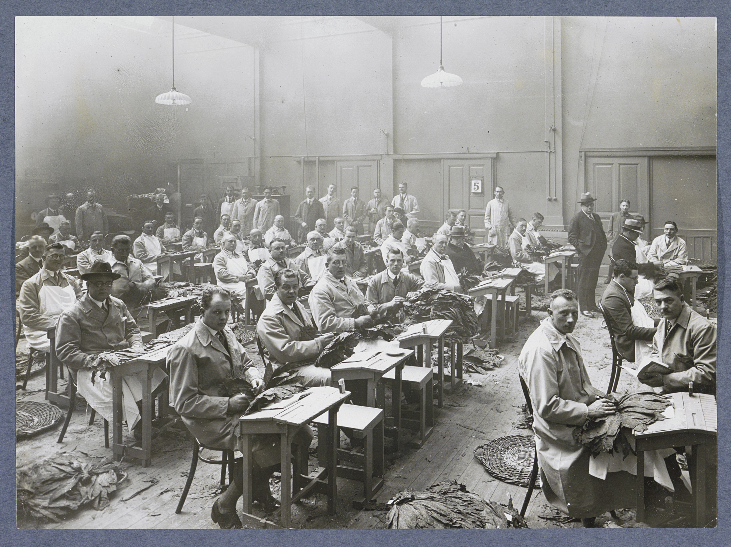 Mannen verwerken tabaksbladeren in een zaal, vermoed...