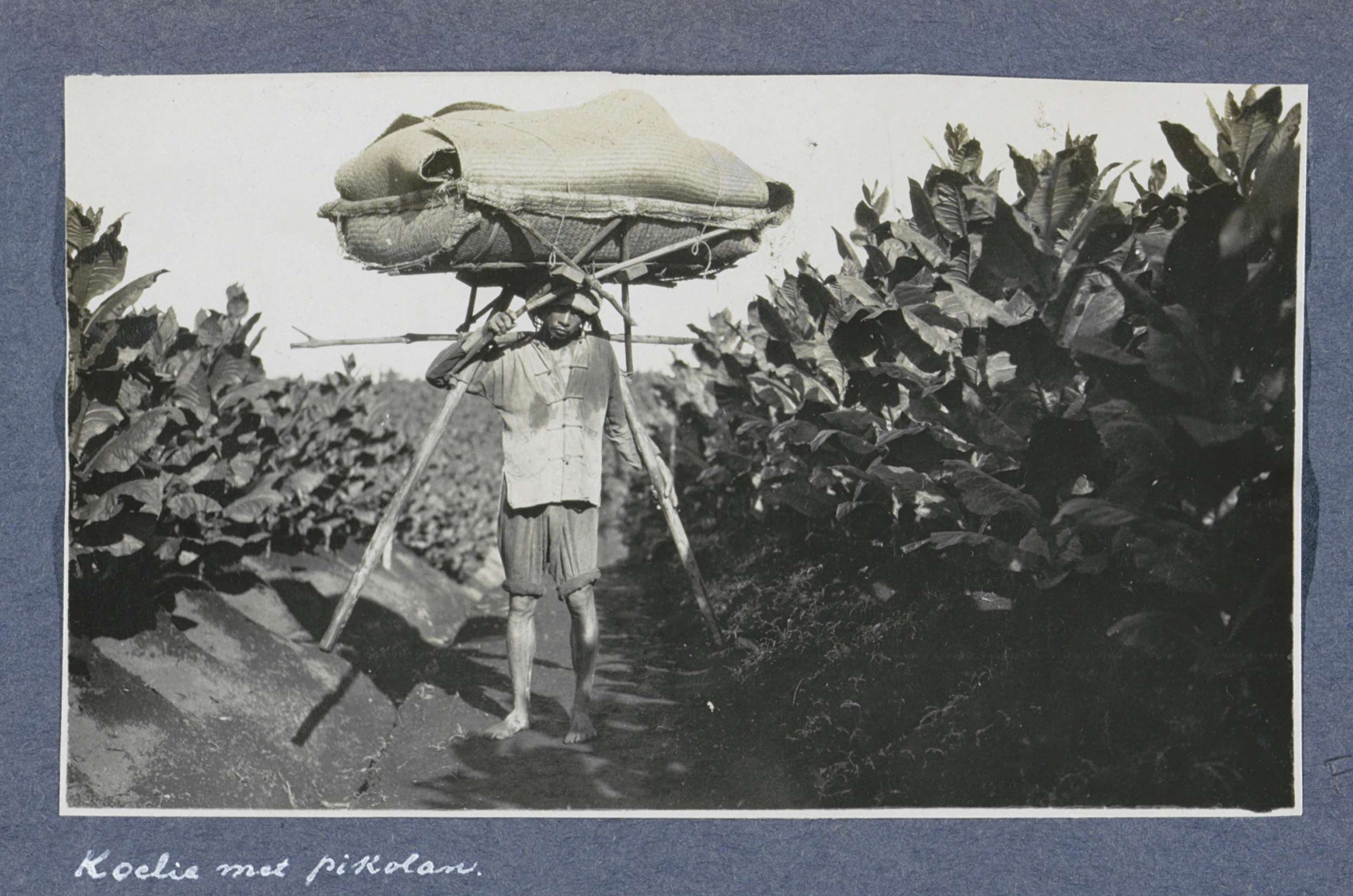 Contractarbeider met draagstok (pikolan) tussen gewa...