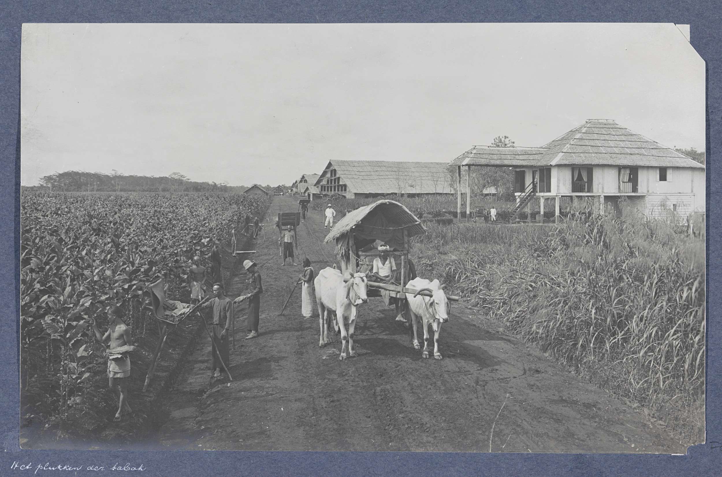 Planten van tabak met ossenwagen op een plantage op ...
