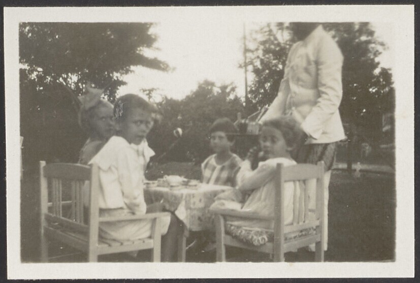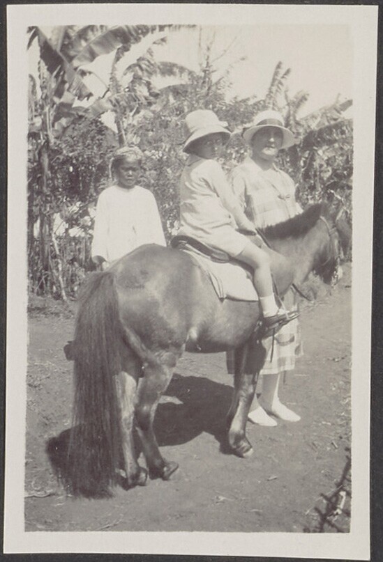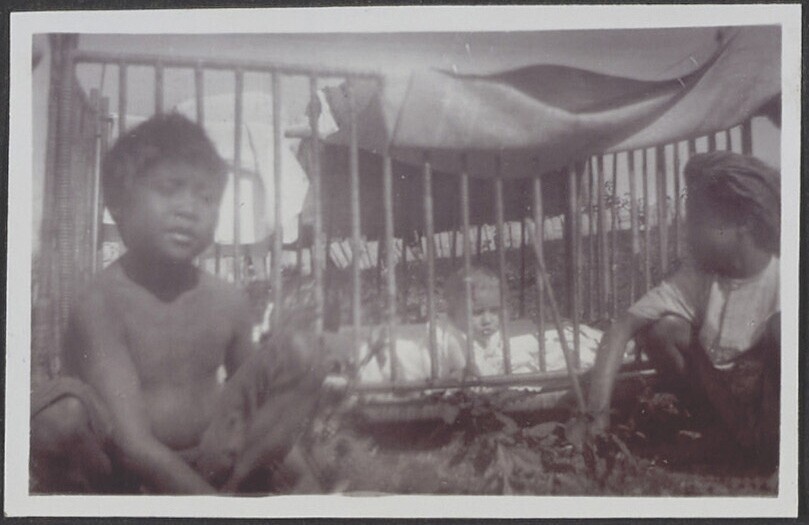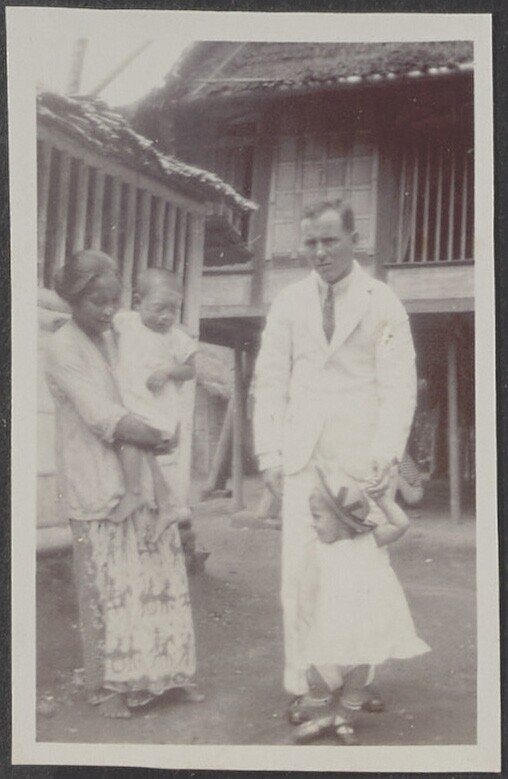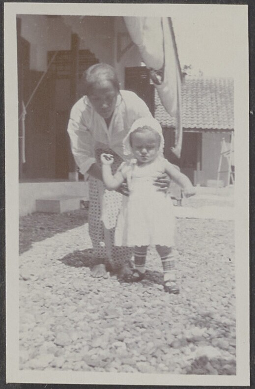 Europees kind met Javaanse kinderverzorgster in de tuin