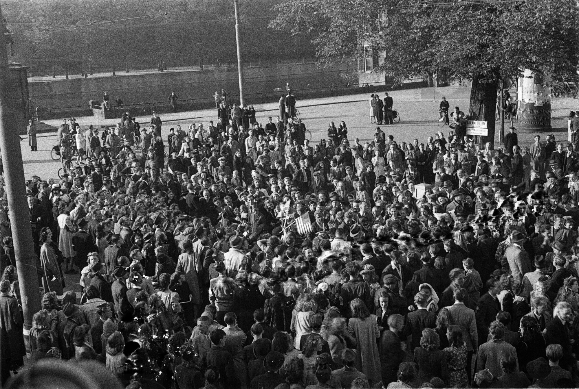 Een menigte staat op een plein in Den Haag (mei, 1945)