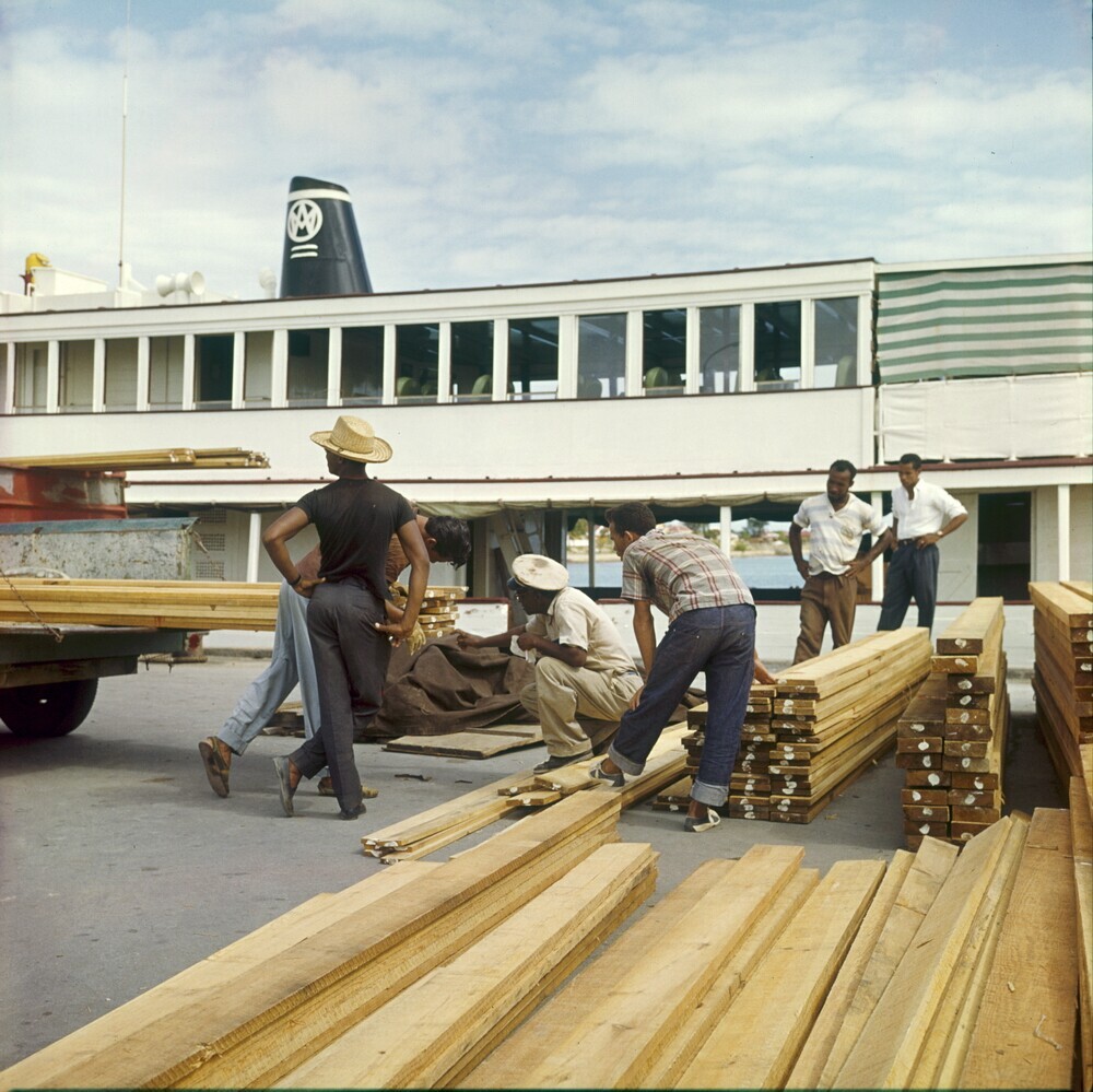 Afladen van hout bij de haven van Kralendijk, met aa...