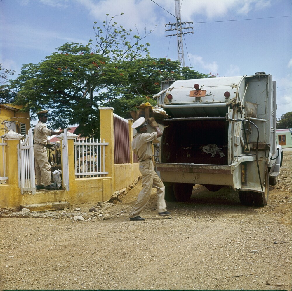 Mannen halen de vuilnis op met vuilniswagen