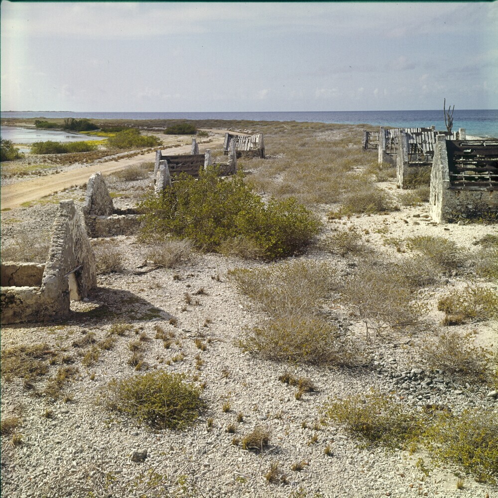 Vervallen onderkomens van tot slaaf gemaakten bij he...