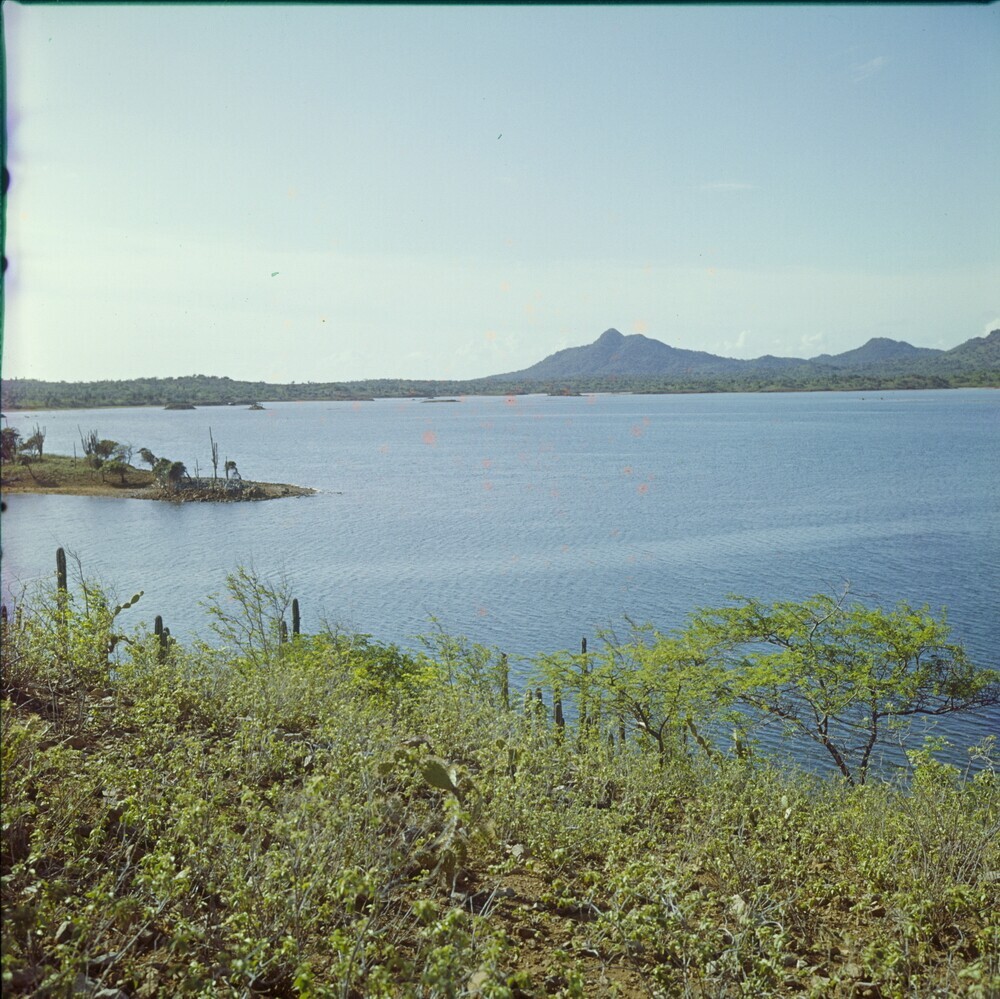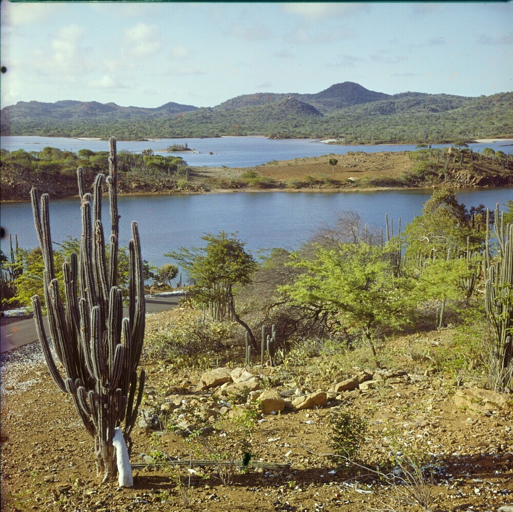 Zicht op het Gotomeer, met cactus op de voorgrond