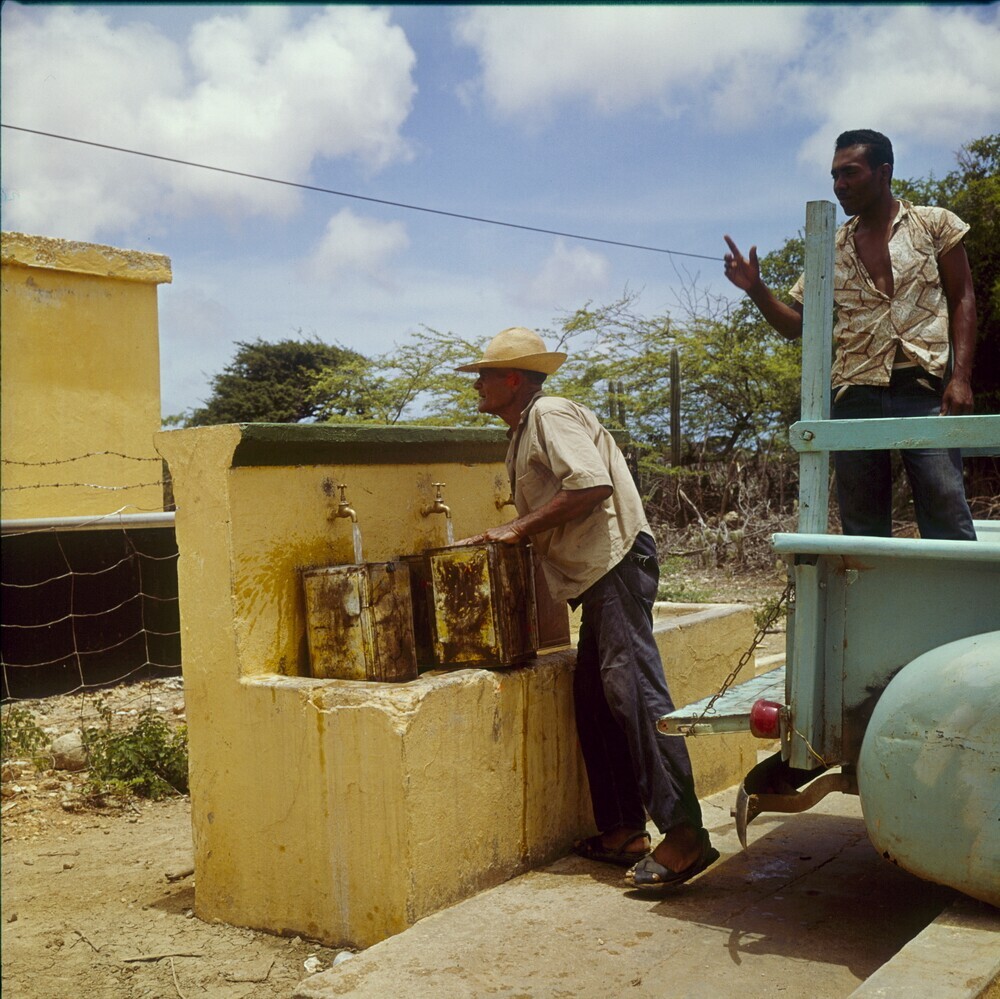 Mannen halen water bij een waterput waarbij het wate...