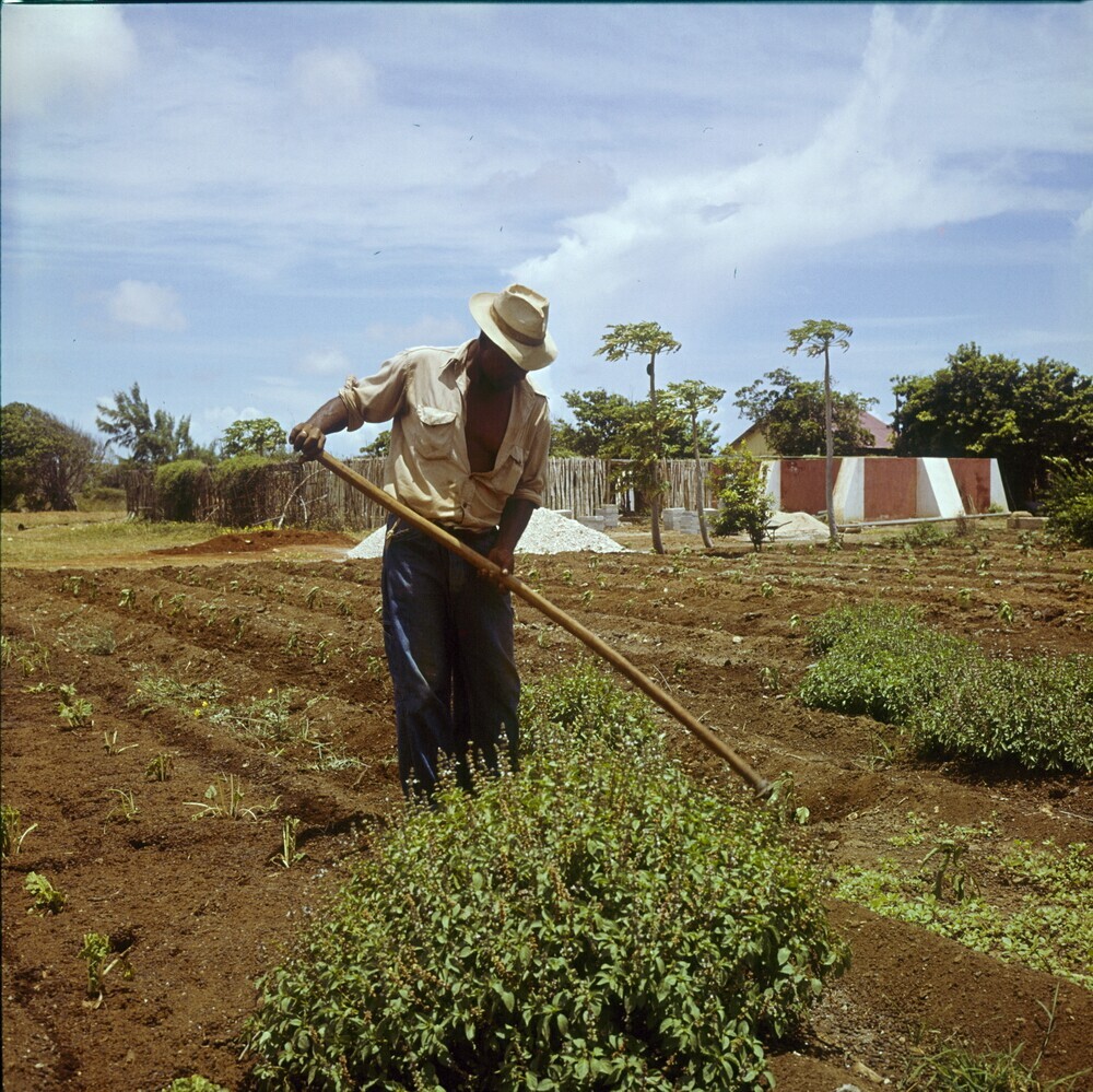 Landarbeider wiedt onkruid op Plantage Aruba
