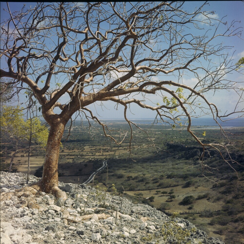Uitzicht over landschap, met op de voorgrond een boom