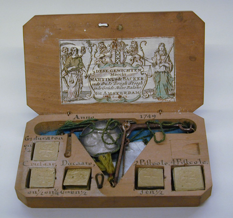 Doosje met 23 gewichten, op bovenkant twee koperen k...