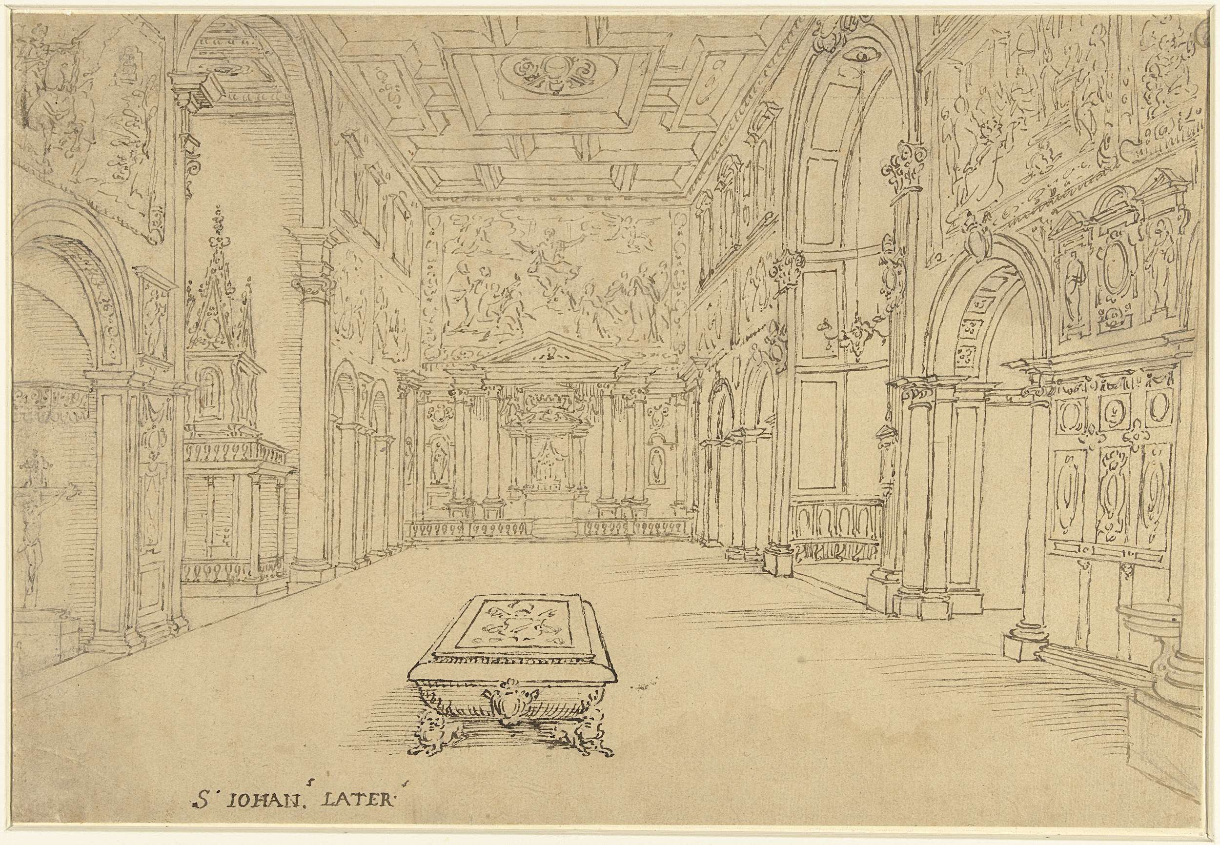 Gezicht op de ruïne van de Sint-Jan de Doperkerk in ...