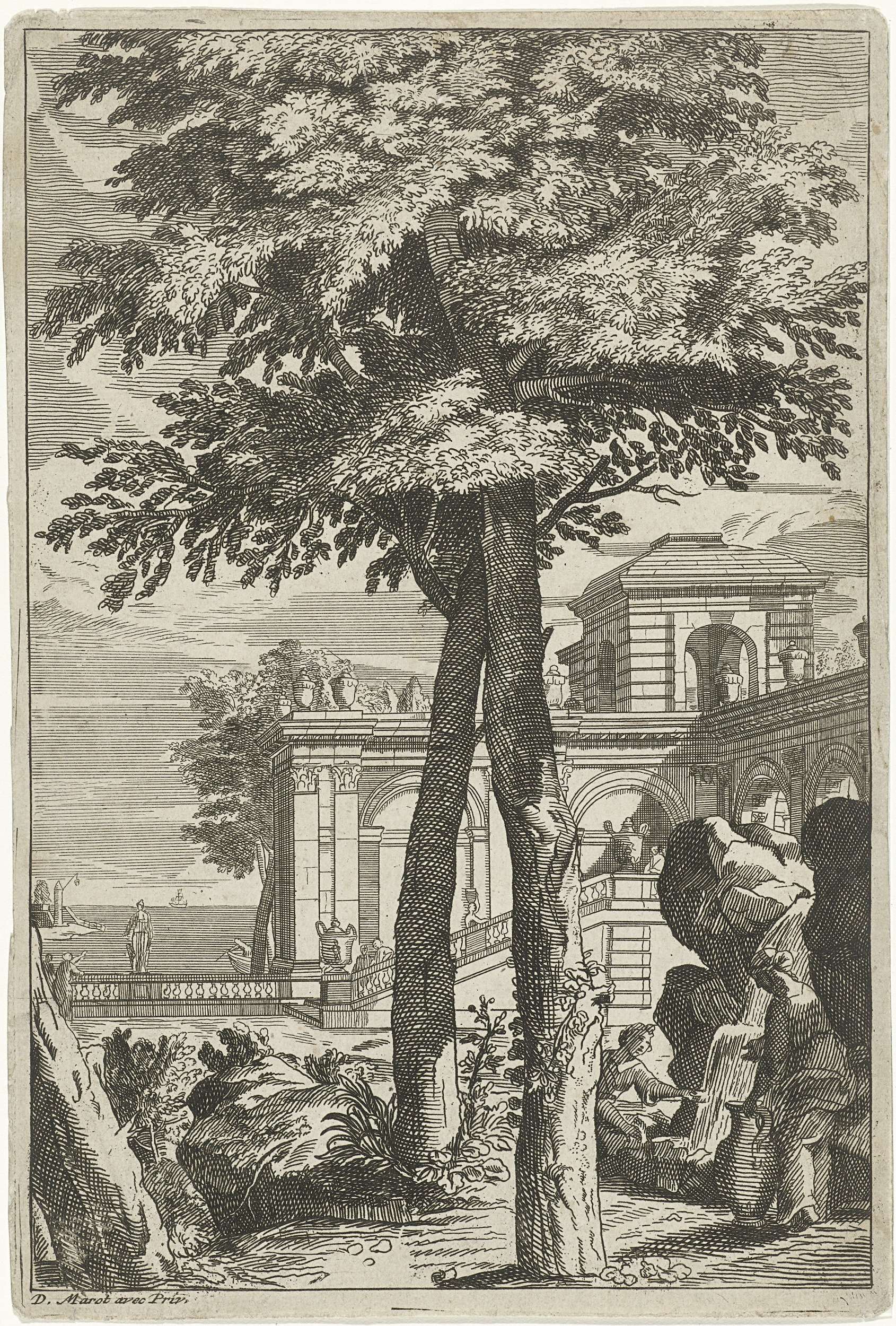 Buitenplaats met waterval waarbij twee vrouwen
