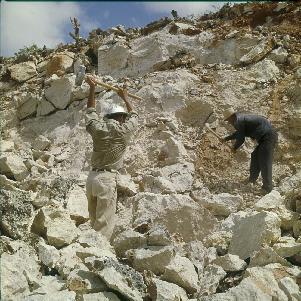 Arbeiders hakken steen bij steenafgraving