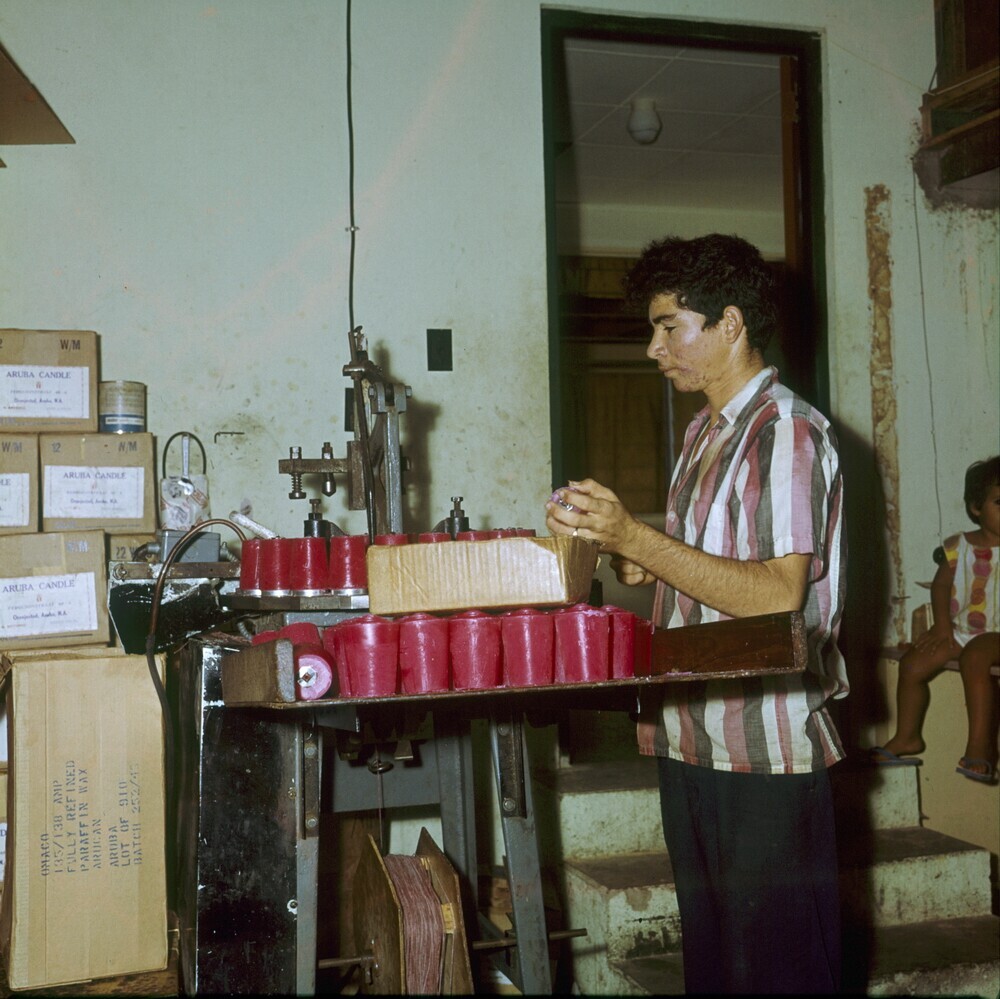 Man aan het werk in een kaarsenfabriek