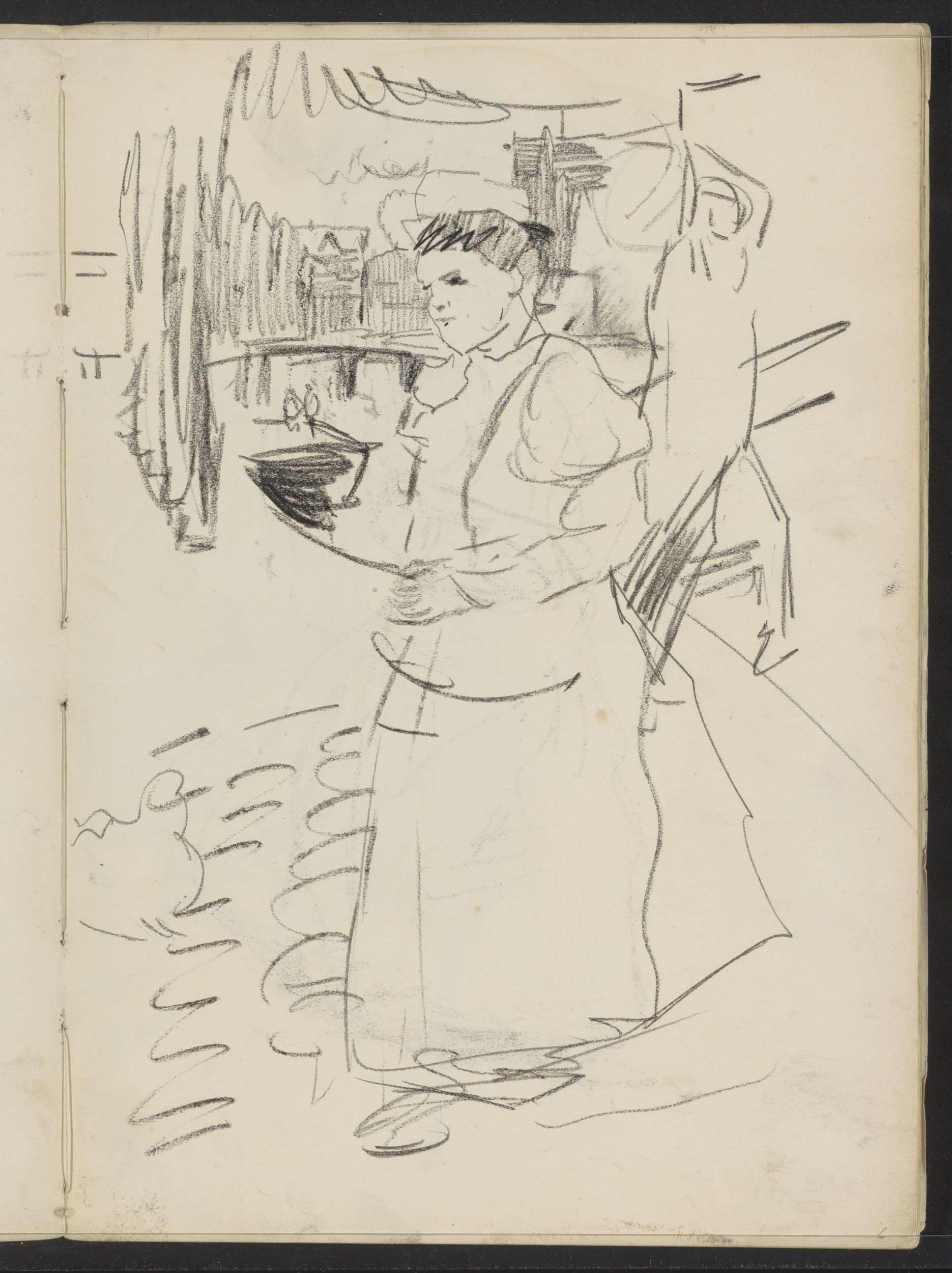 Dienstmeid met een kom op straat
