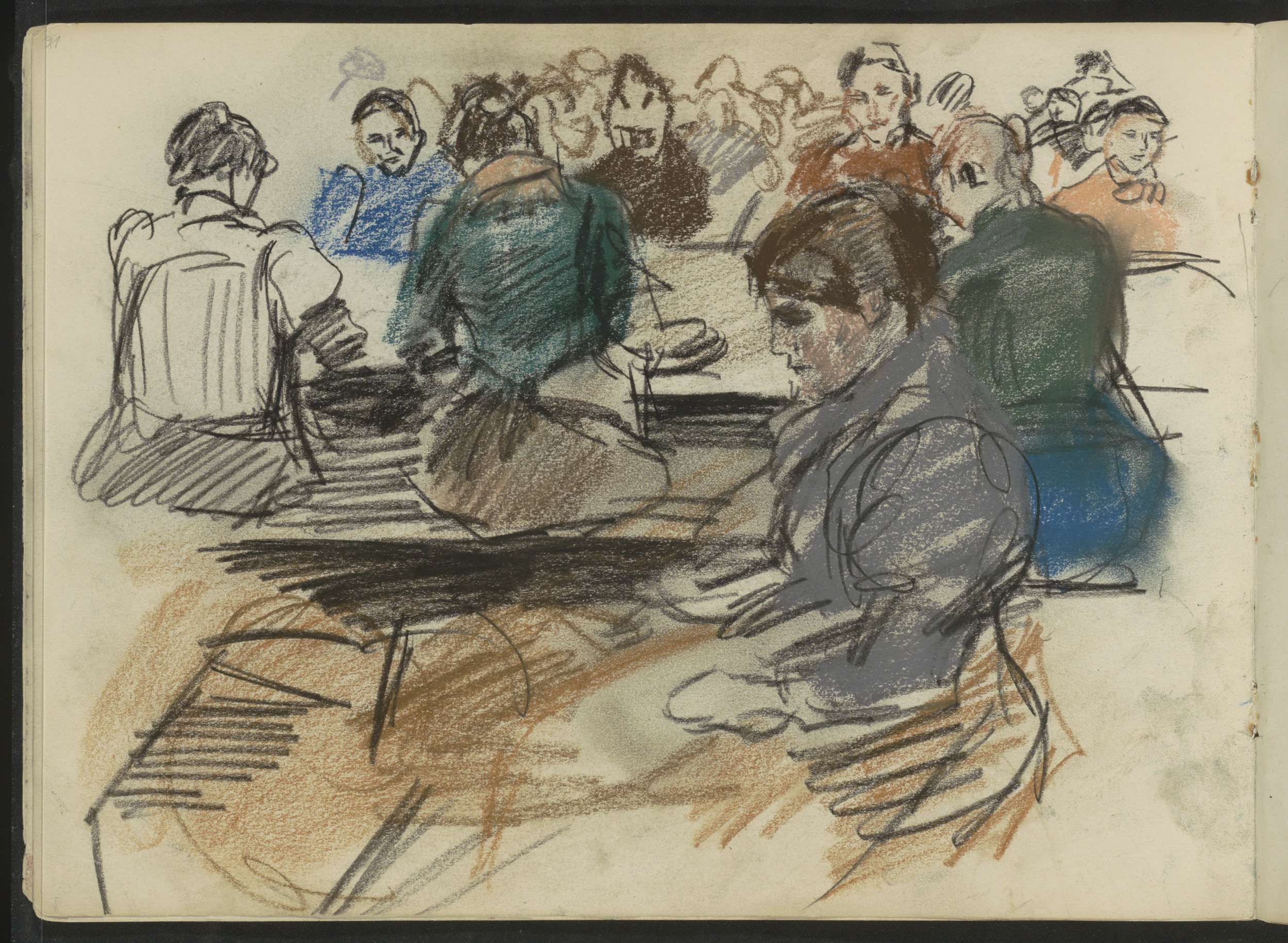 Staande mannen en vrouwen, mogelijk bij een tribune