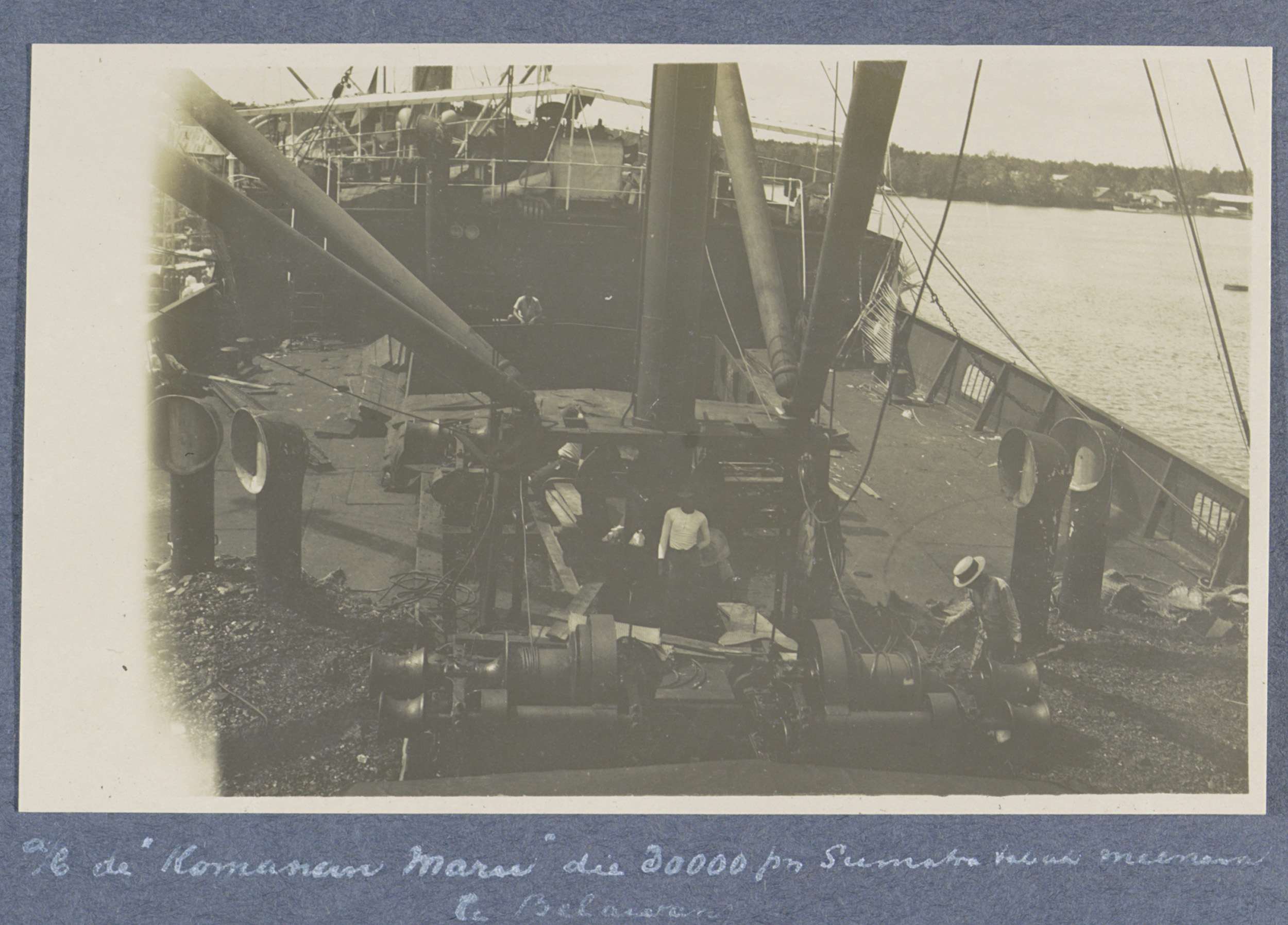 Gezicht op het dek van een schip (Komanam Maru) voor...