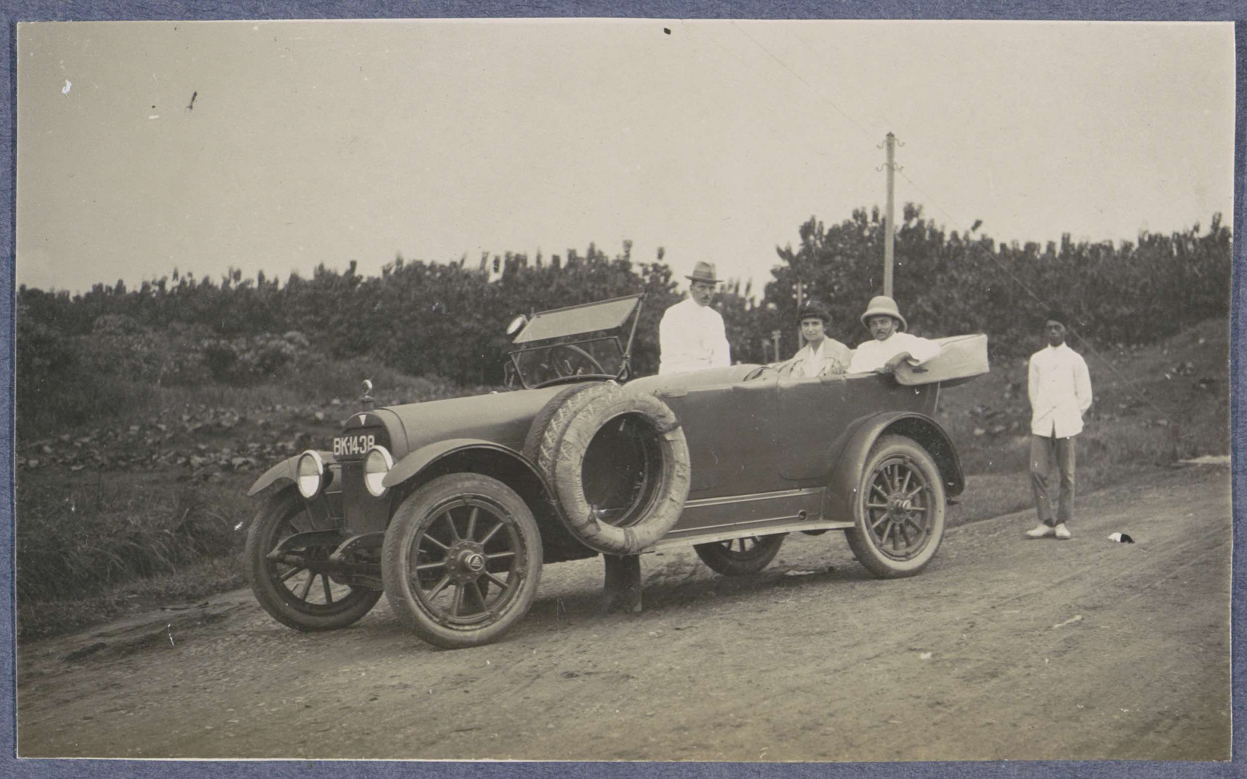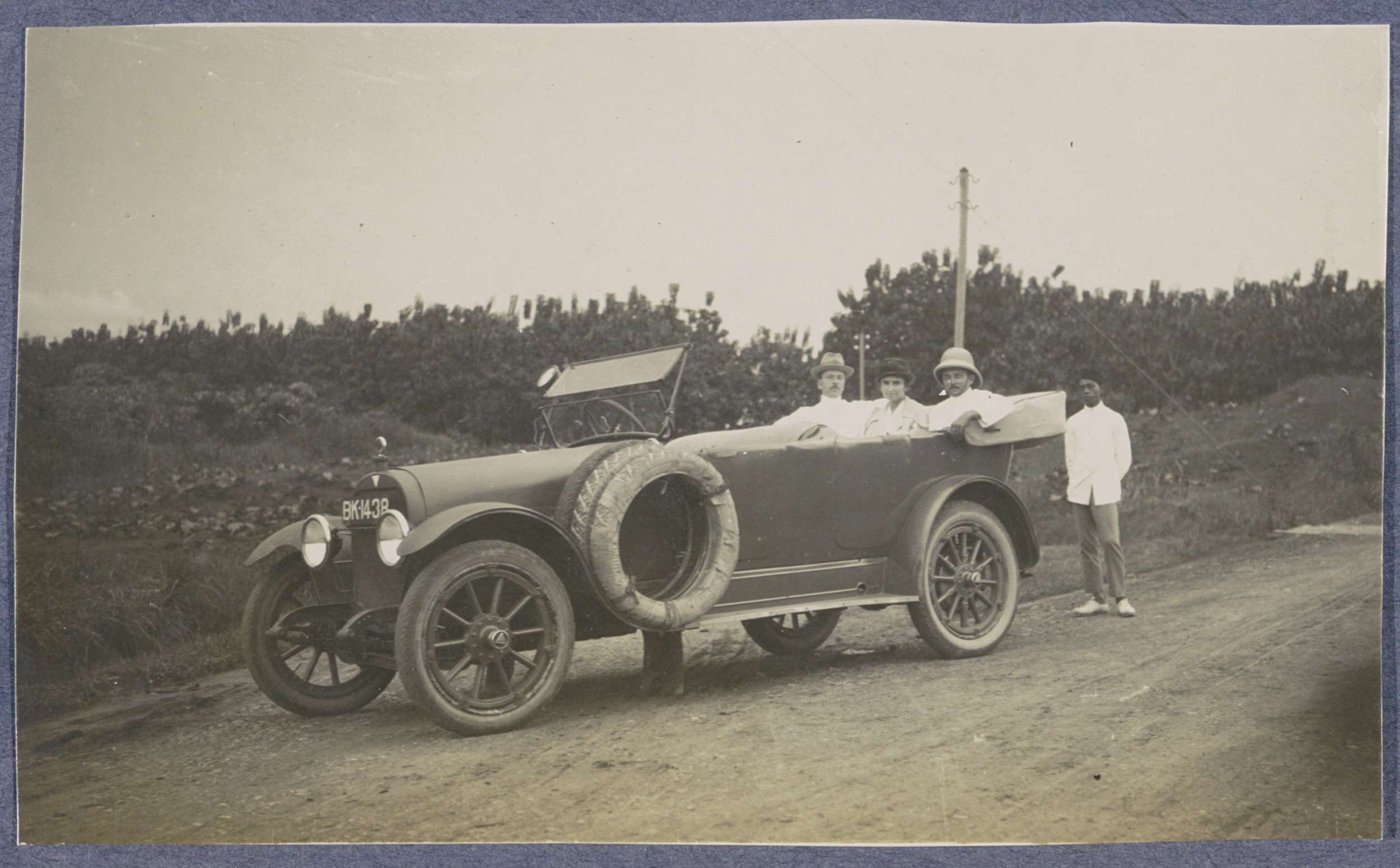 Auto met 'John Lanting', 'C. Kroese', vrouw en een m...