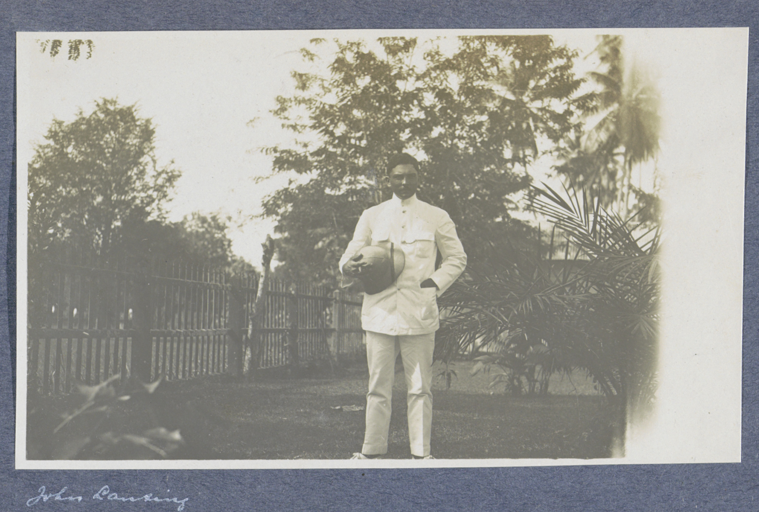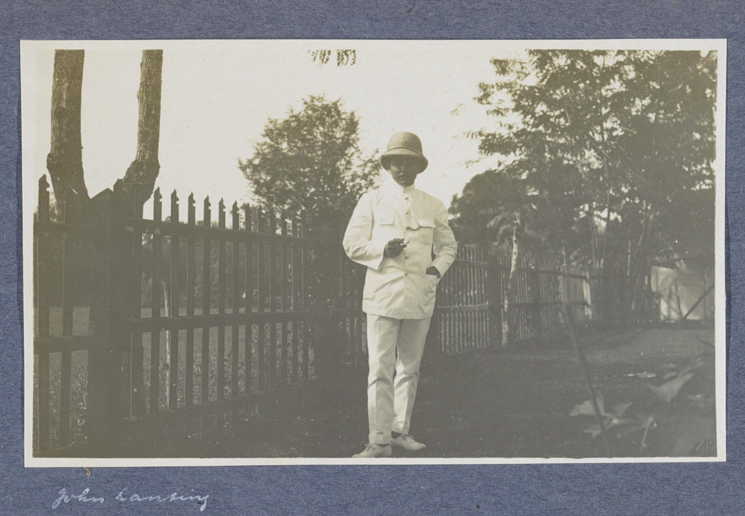 Man aangeduid als 'John Lanting' staand bij een hek,...