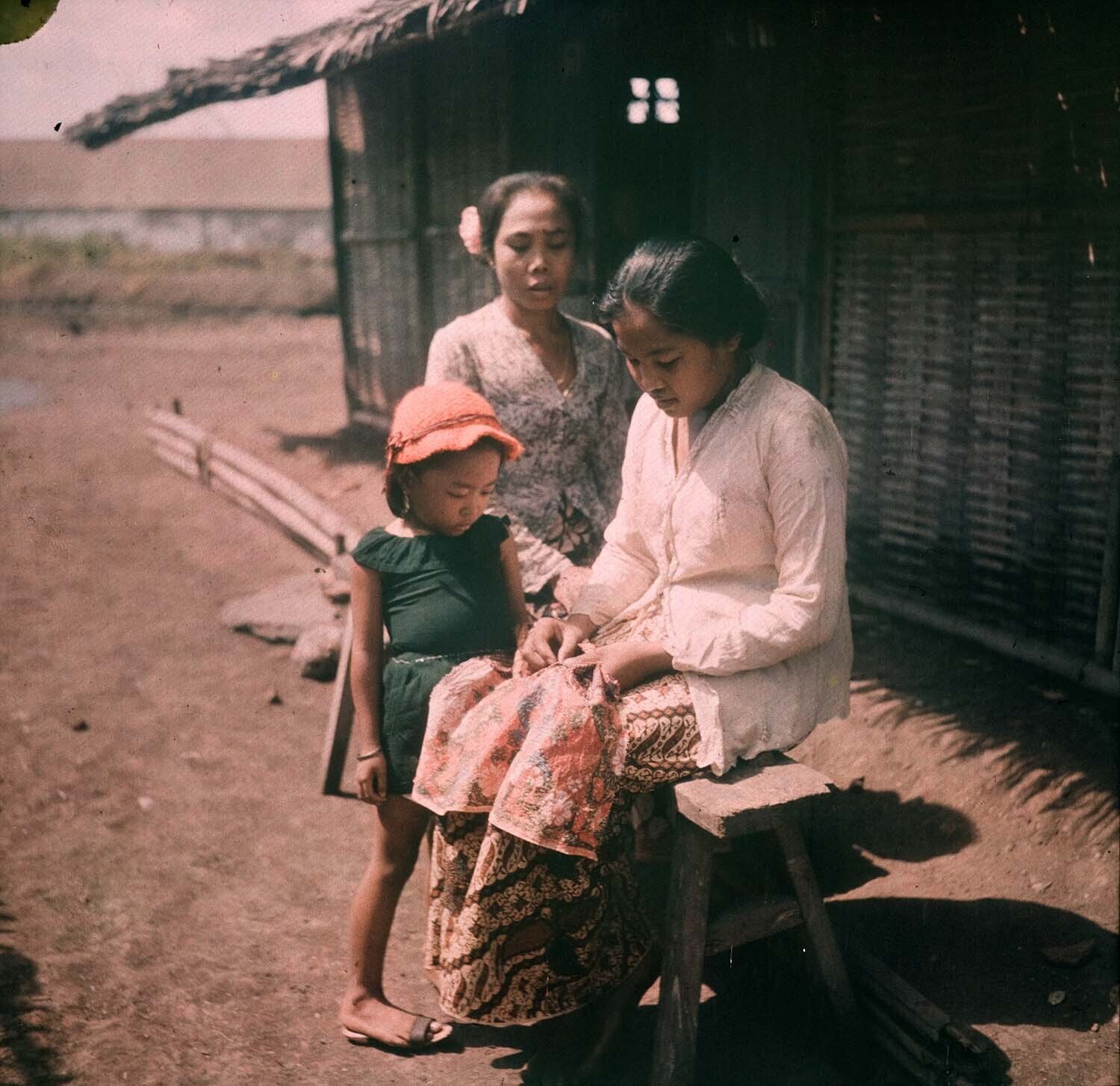 Twee vrouwen en een meisje tijdens het naaien van kl...