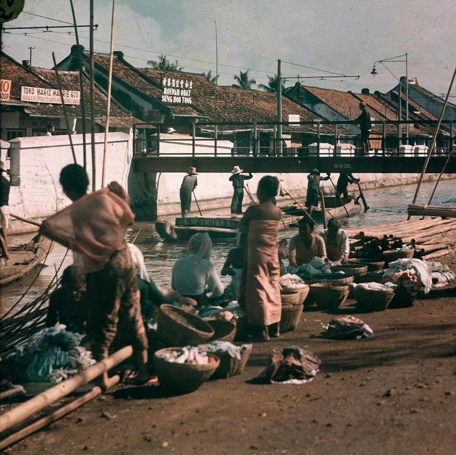 Gezicht over de rivier Ciliwung in Batavia met banan...