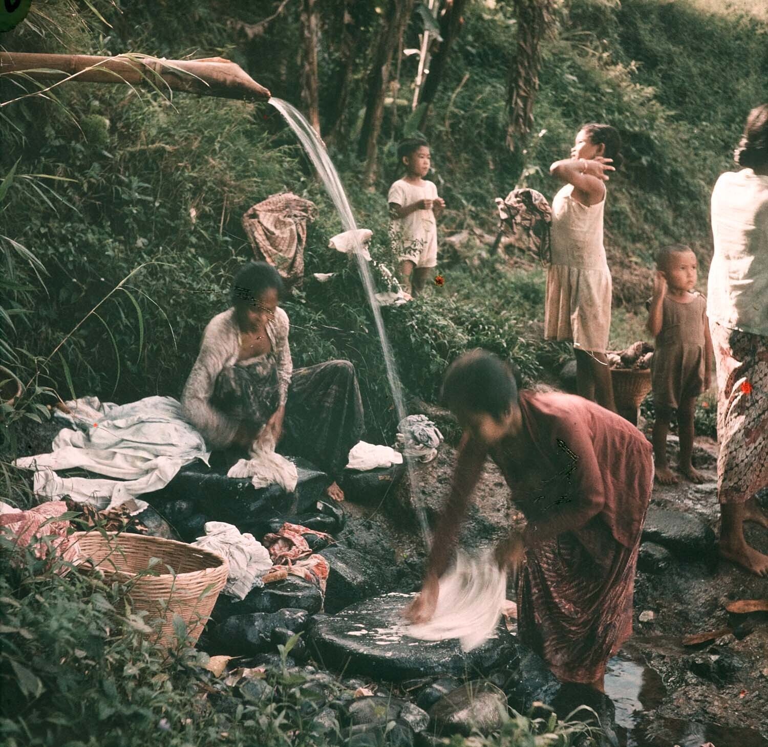 Vrouwen wassen kleding bij een badplaats in de omgev...