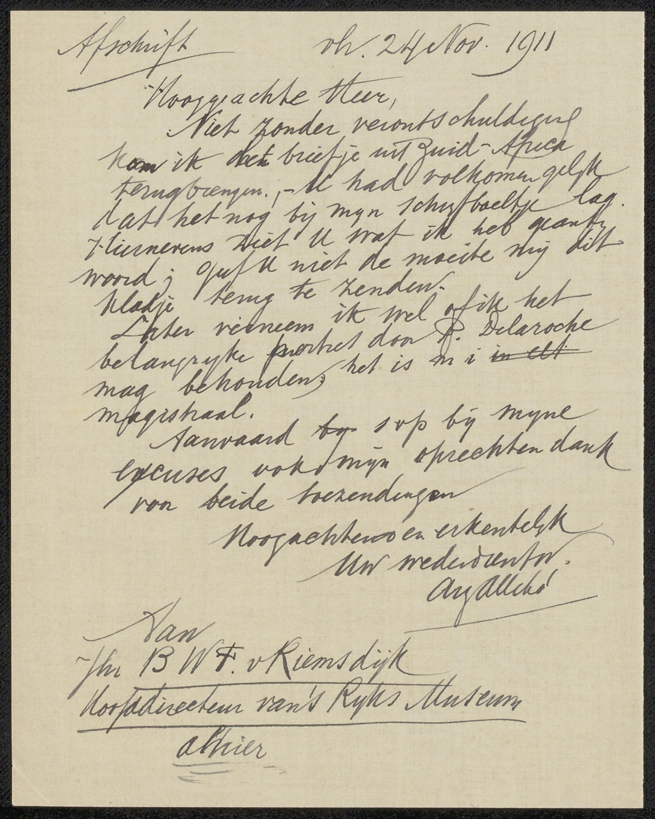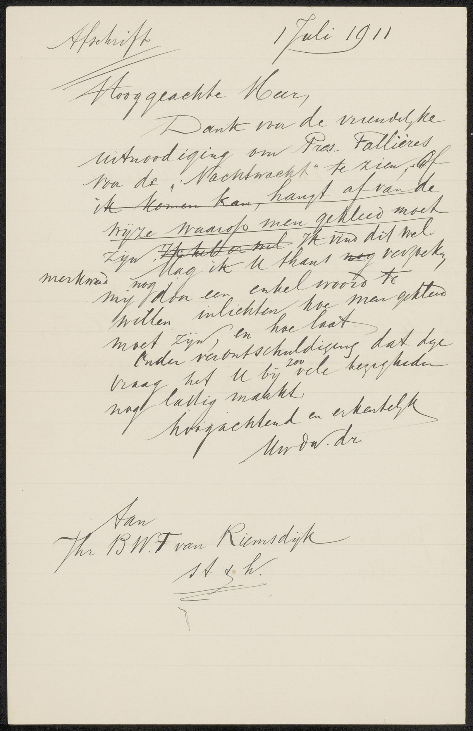 Brief aan jonkheer Barthold Willem Floris van Riemsdijk