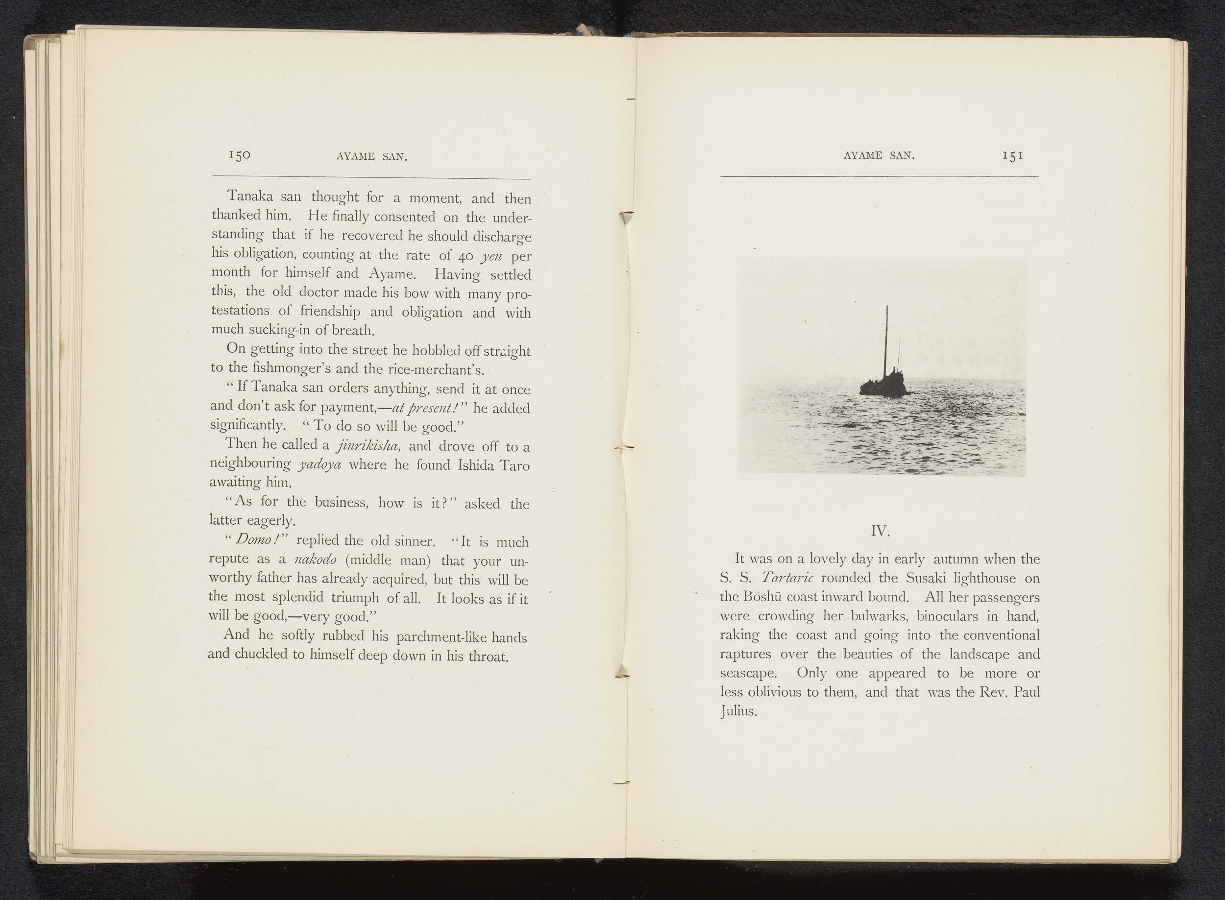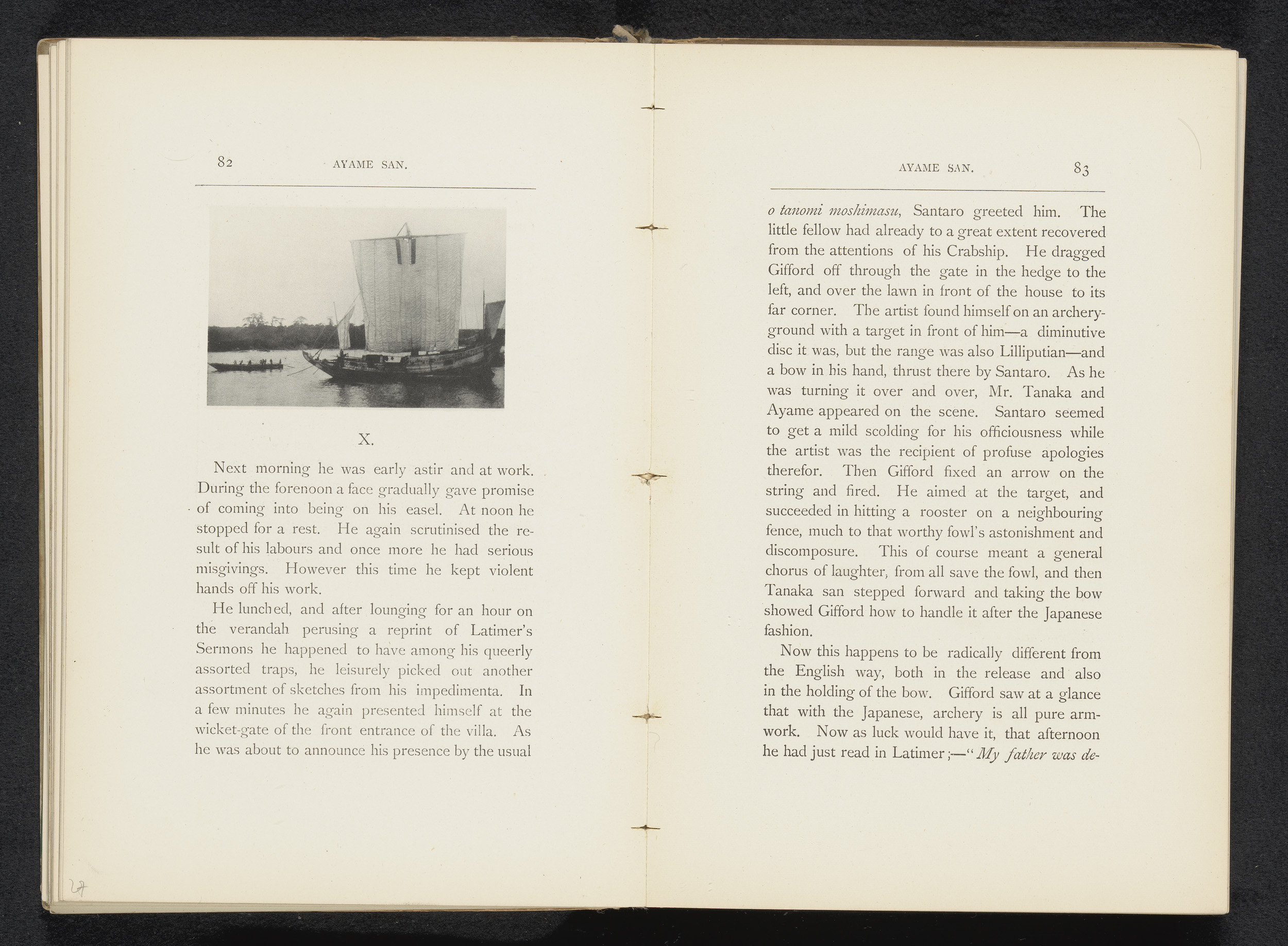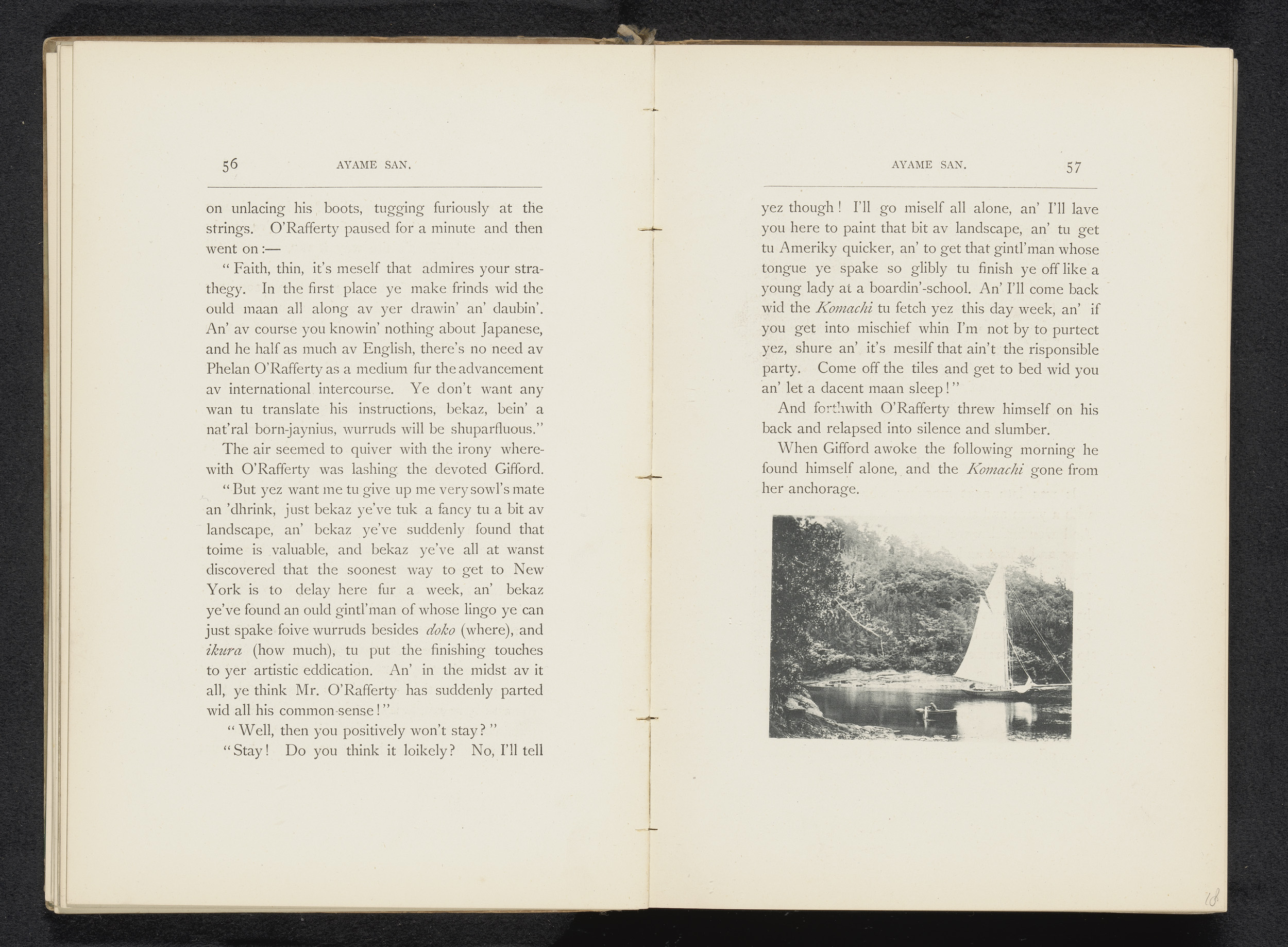 Zeilschip en een roeiboot op een rivier te Japan