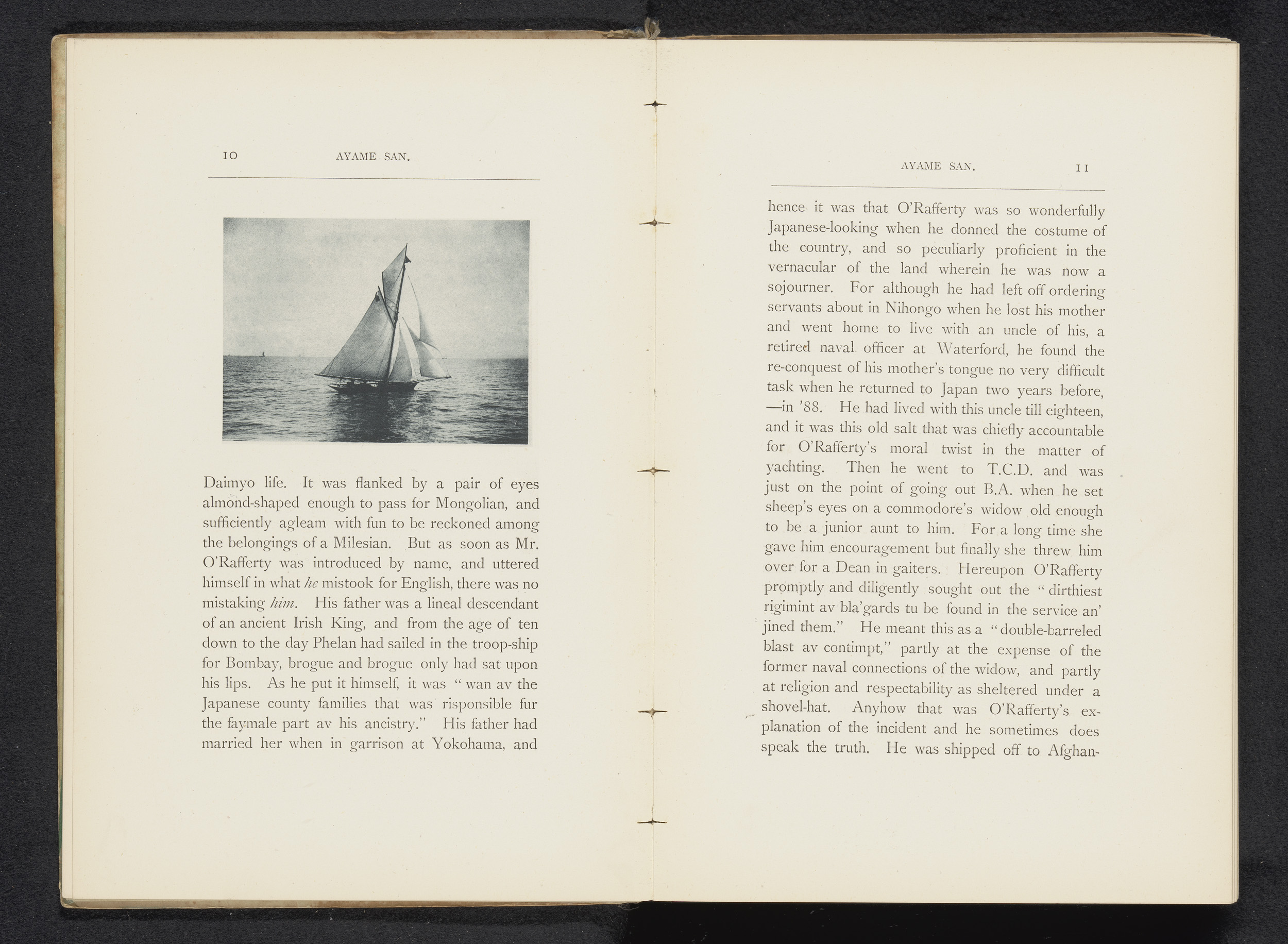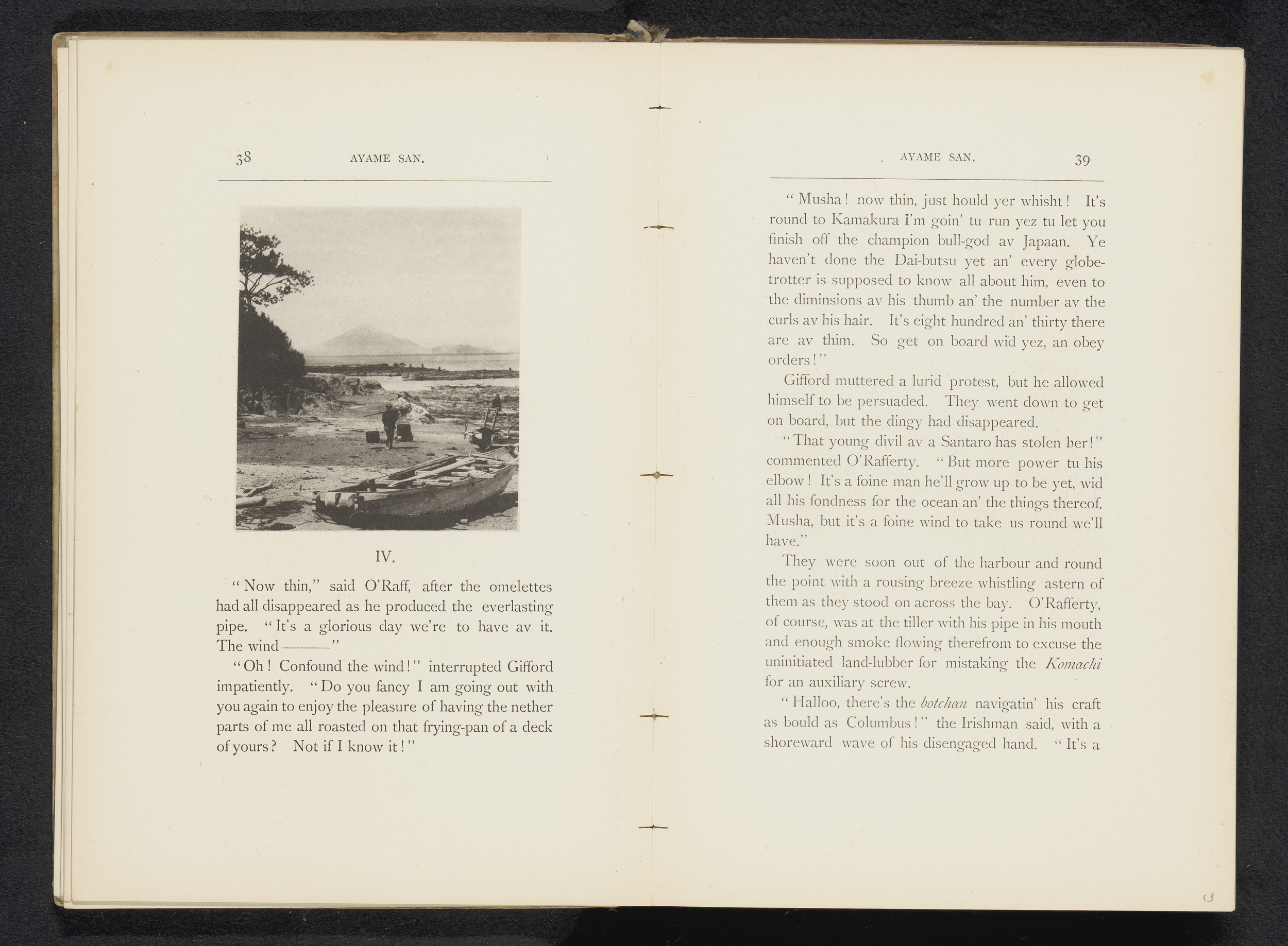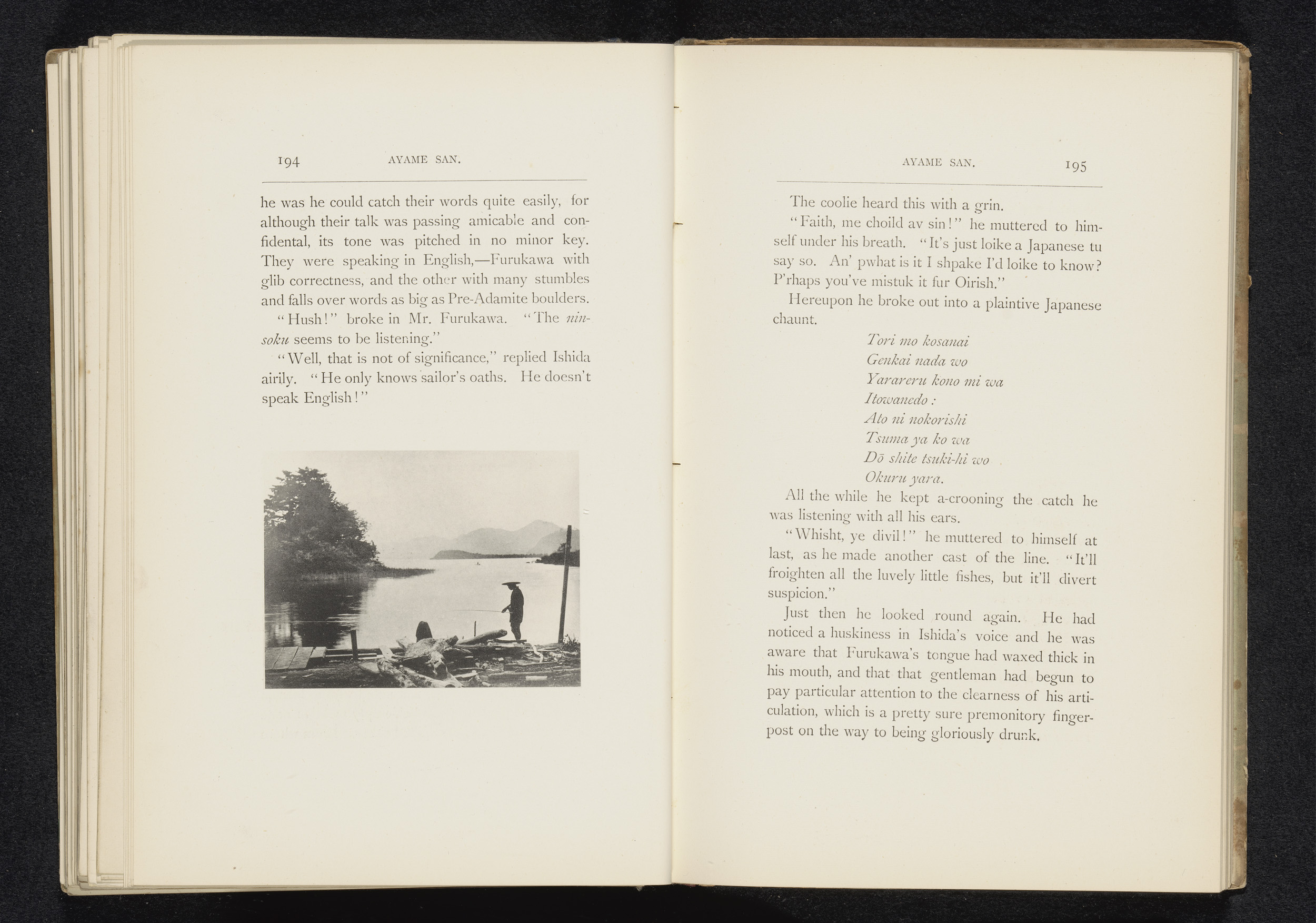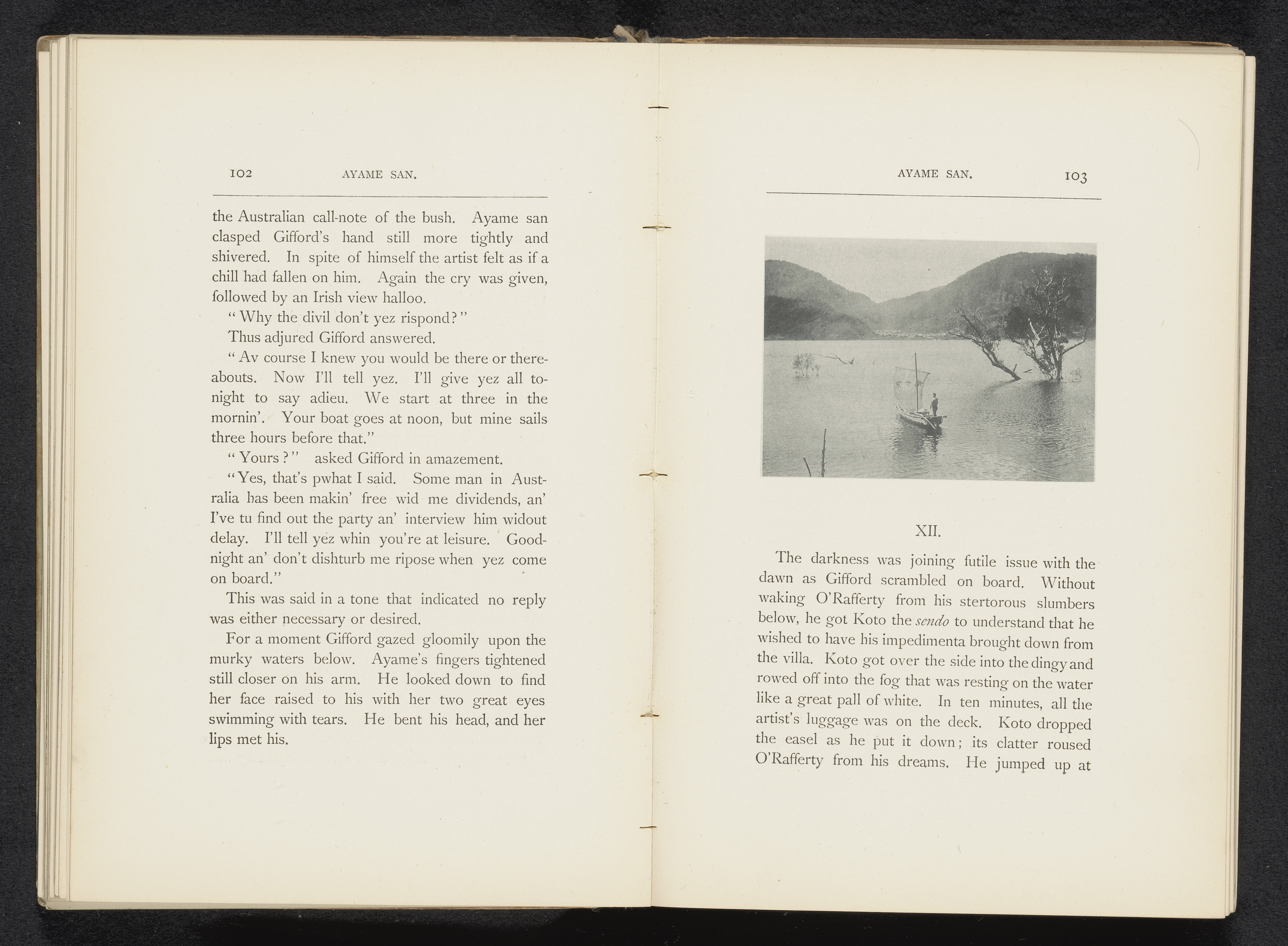 Zeilschip en een roeiboot op een rivier te Japan