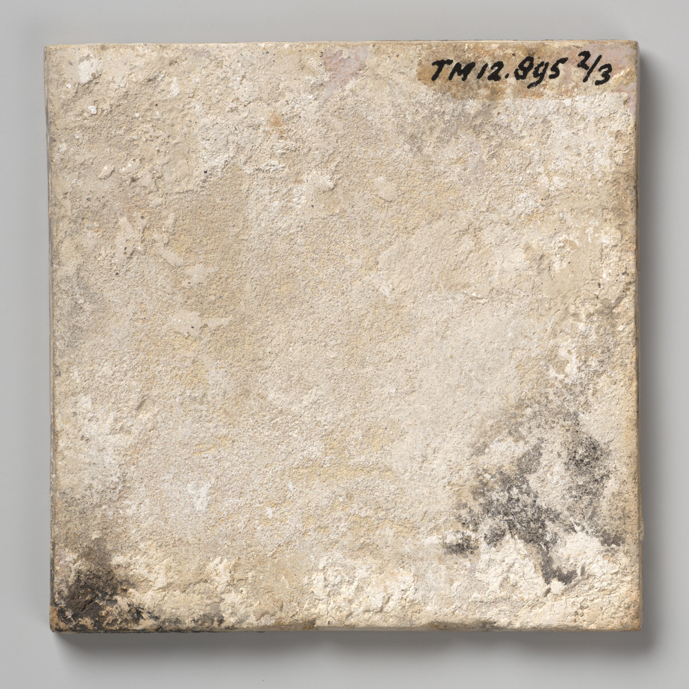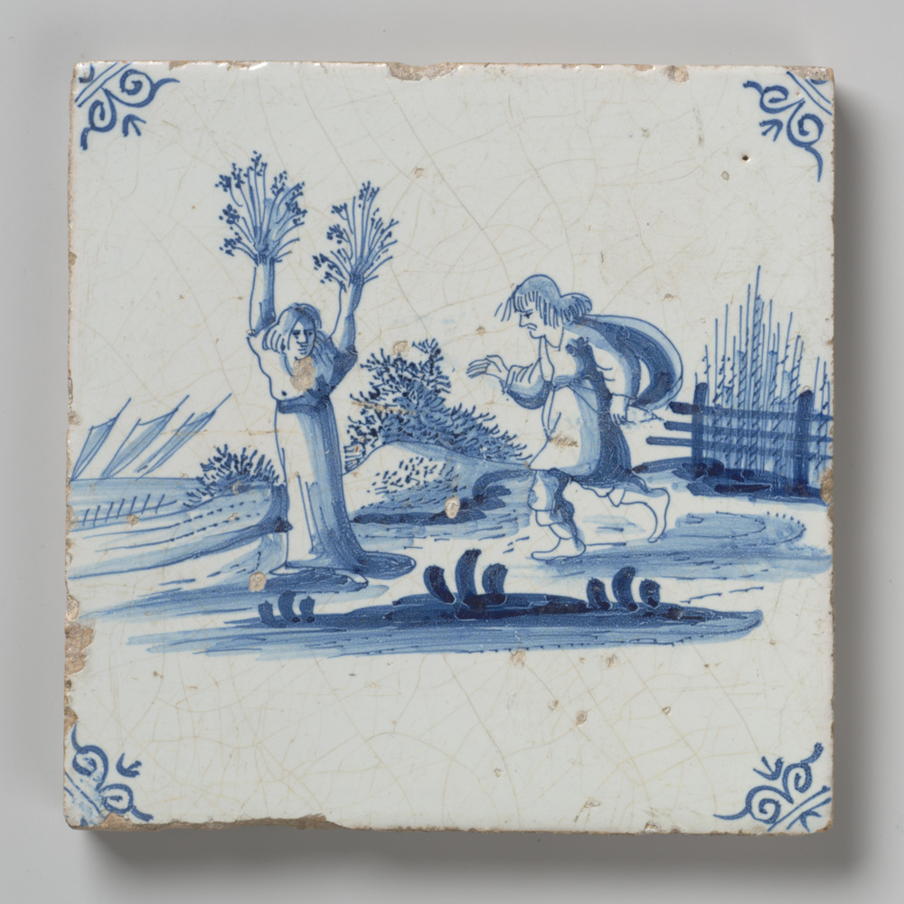 tegel van keramiek met tinglazuur, voorstellende: dr...