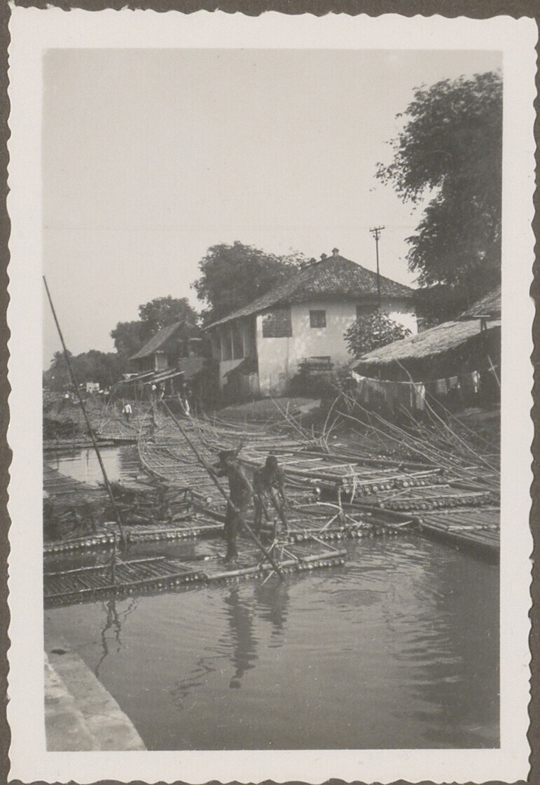 Twee mannen lopen over vlotten van bamboestammen