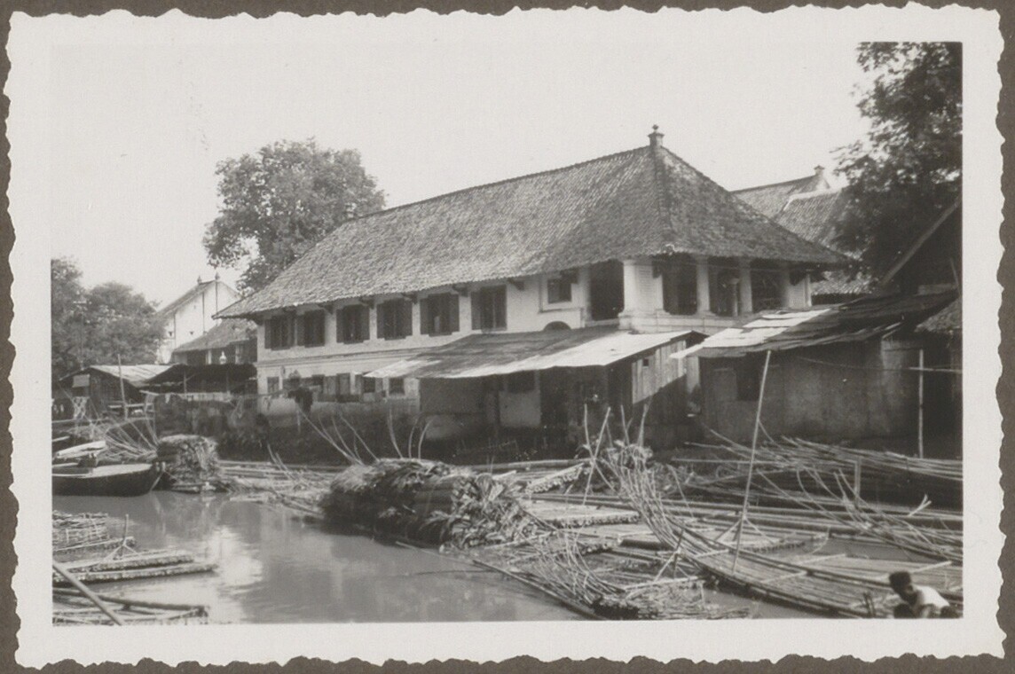 Gebouw van Javasche Bank en passerende boer met een ...
