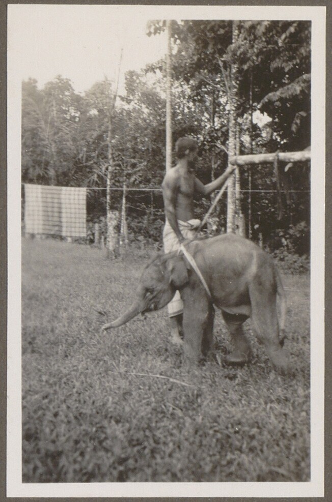 Man bindt jonge olifant vast aan een boomstronk
