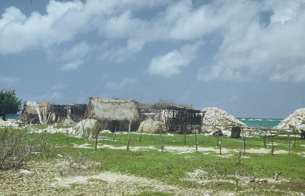 Vissershutjes bij de lagune Lac, op de achtergrond s...