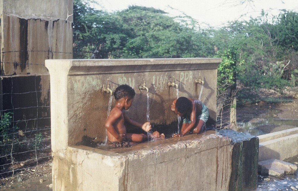 Badende jongens onder verschillende kranen