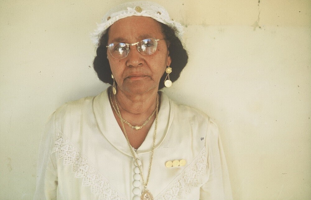 Antilliaanse vrouw met hoofdbedekking en sieraden va...