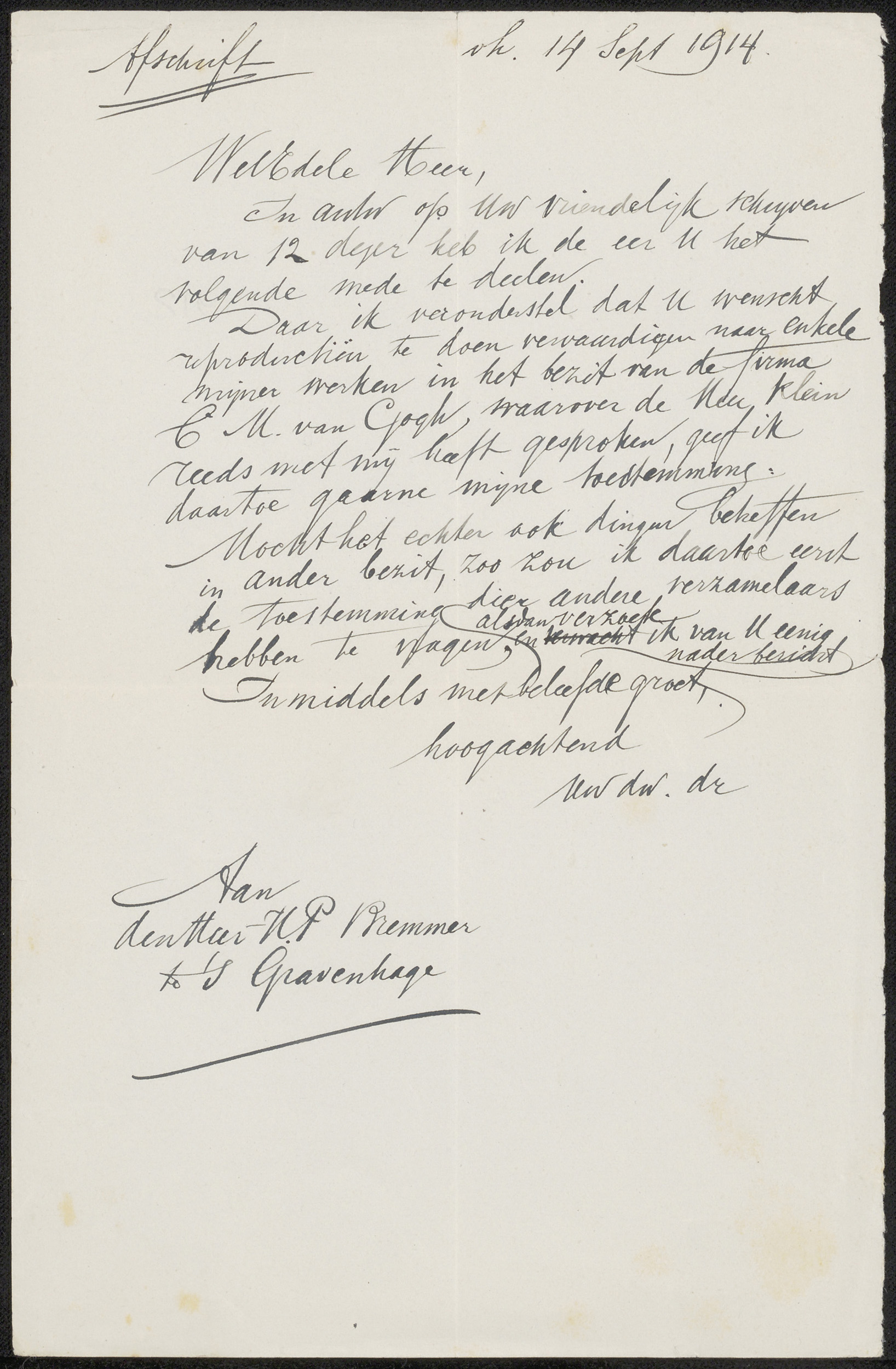 Brief aan Hendricus Petrus Bremmer