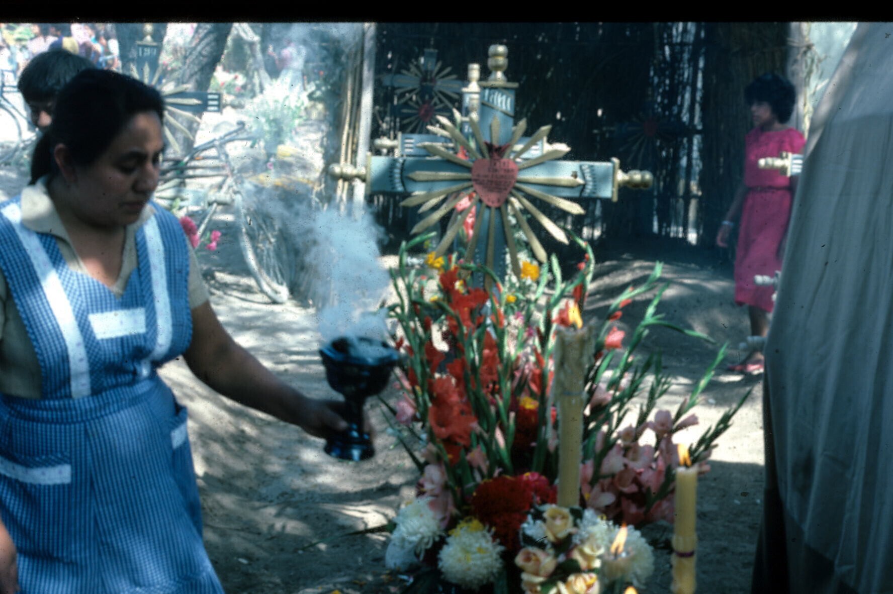 vrouw bij graf met bloemen; NB incensario (wierookbr...