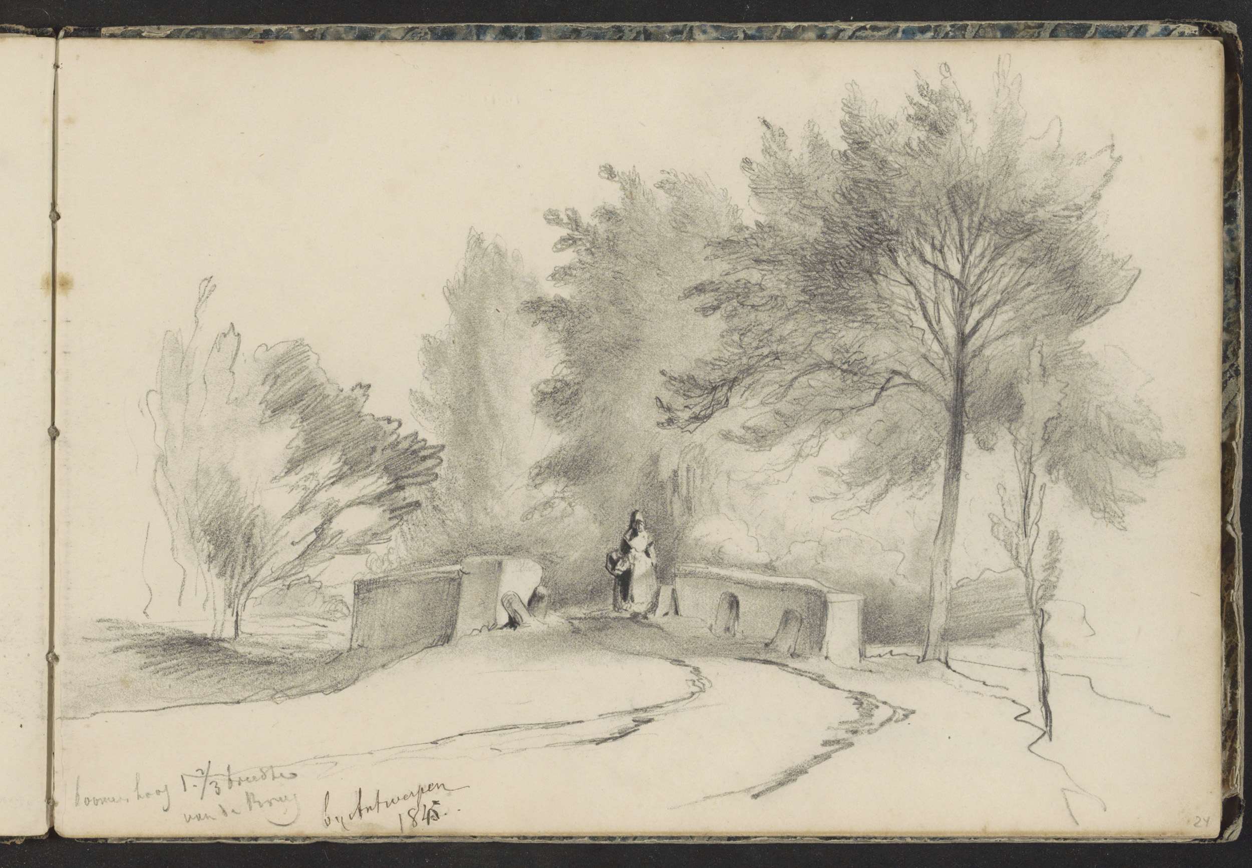 Vrouw op de brug van een boomrijk pad bij Antwerpen