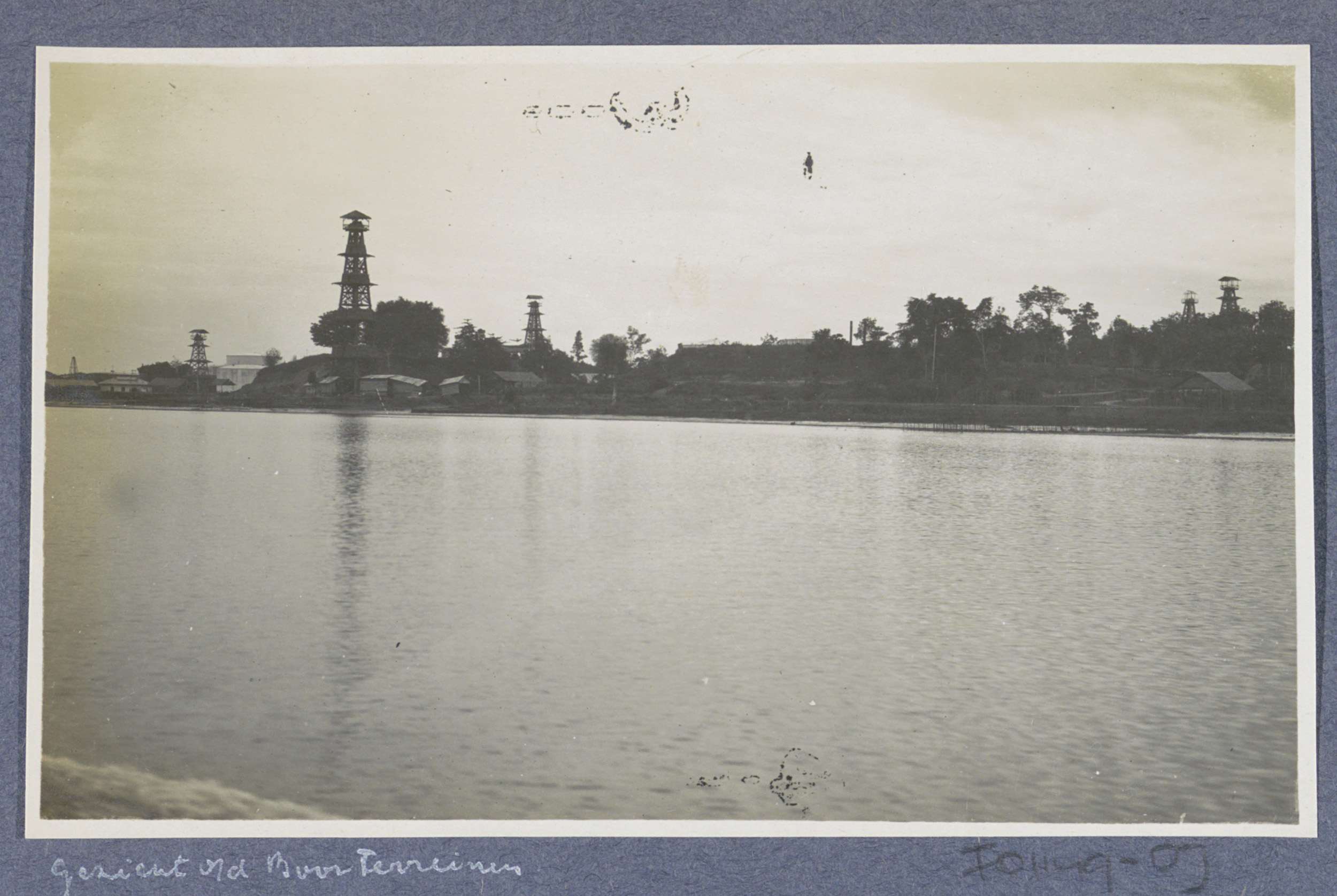 Water met boortorens te Pangkalansusu op Sumatra