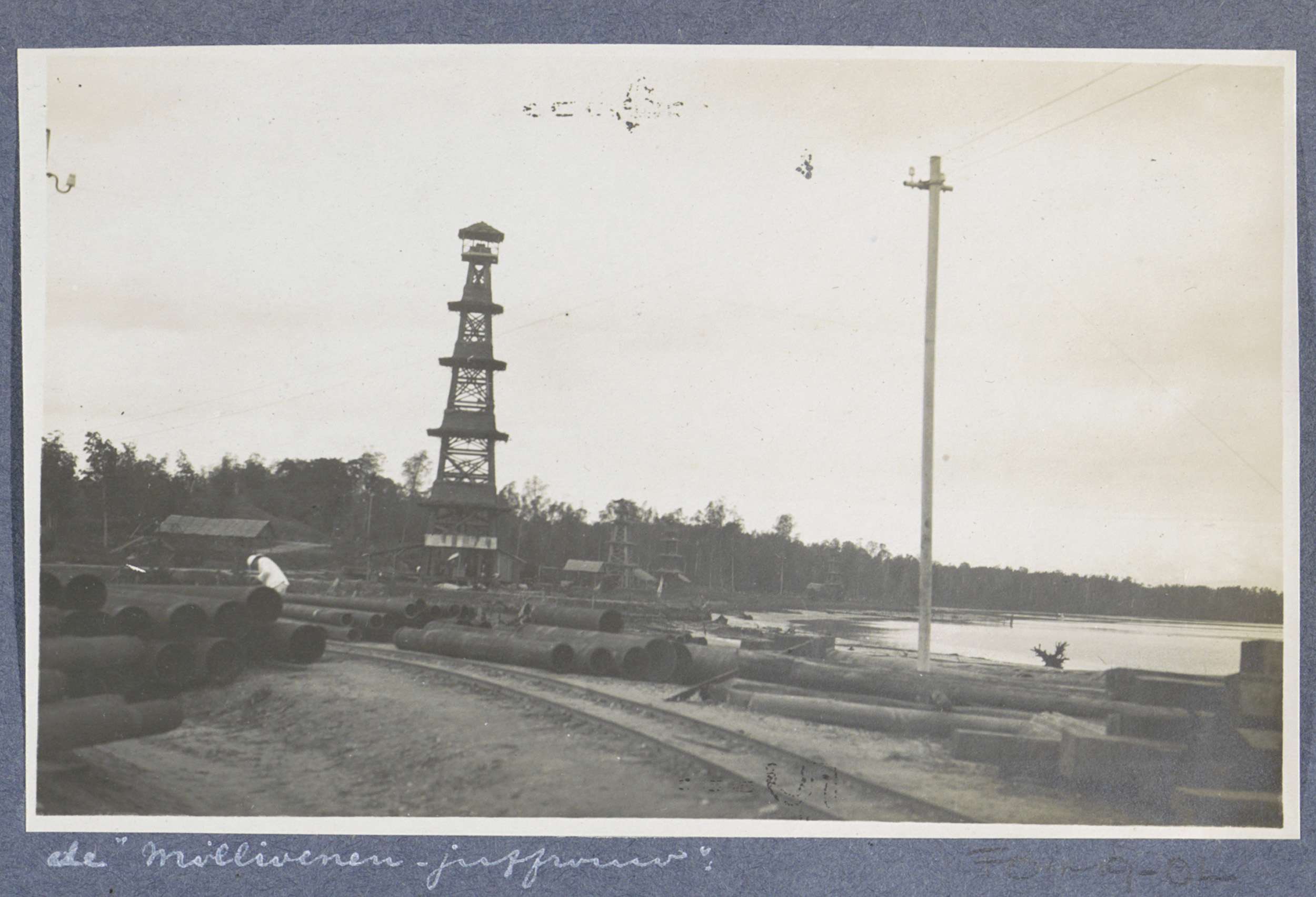 Kade met buizen en de boortoren 'millioenen-juffrouw...